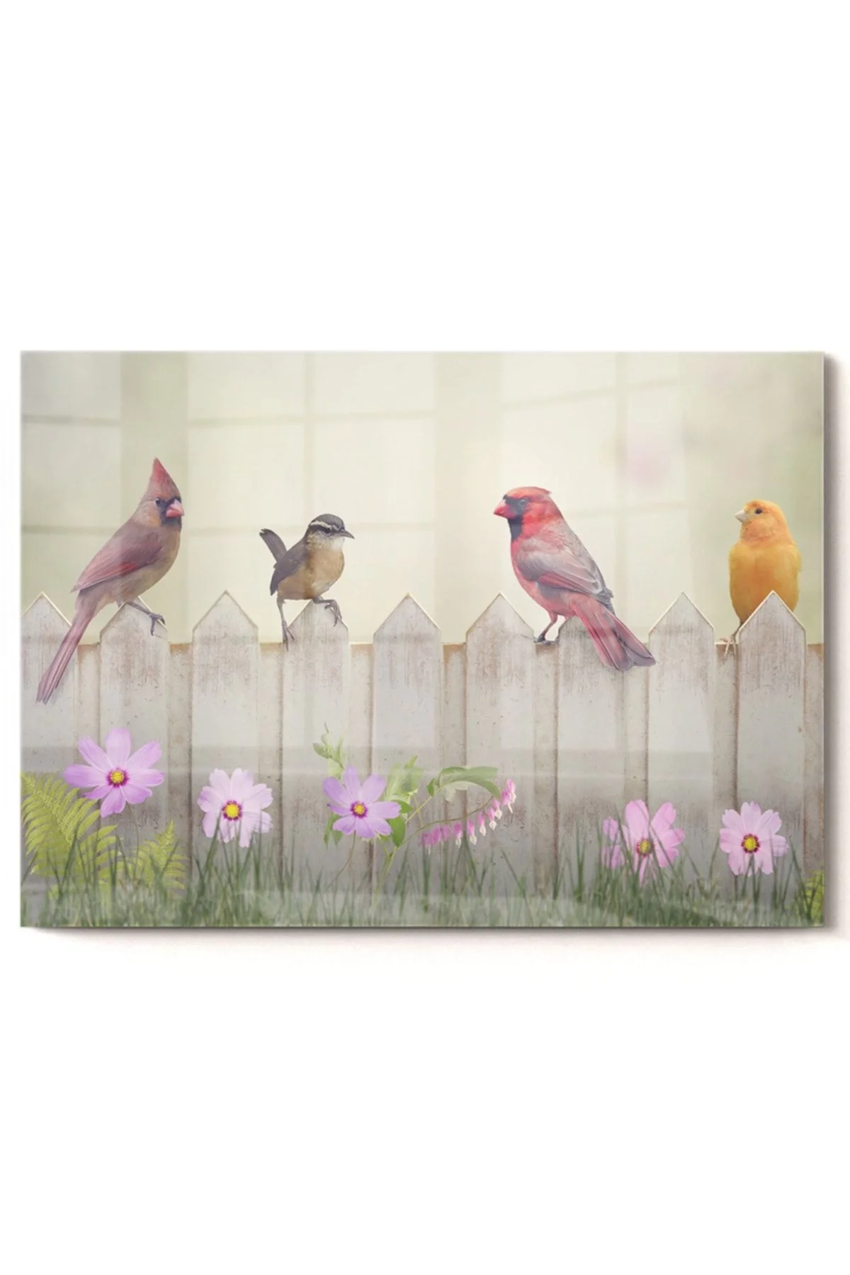 Colorful Sparrows And Pink Flowers | Animal Themed Glass Painting | 50x70cm