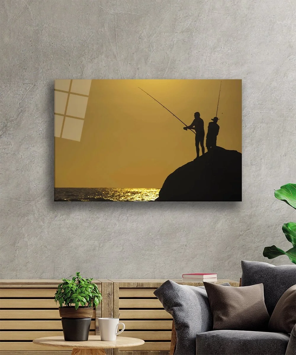 Glass Painting of Friends Fishing at Sunset