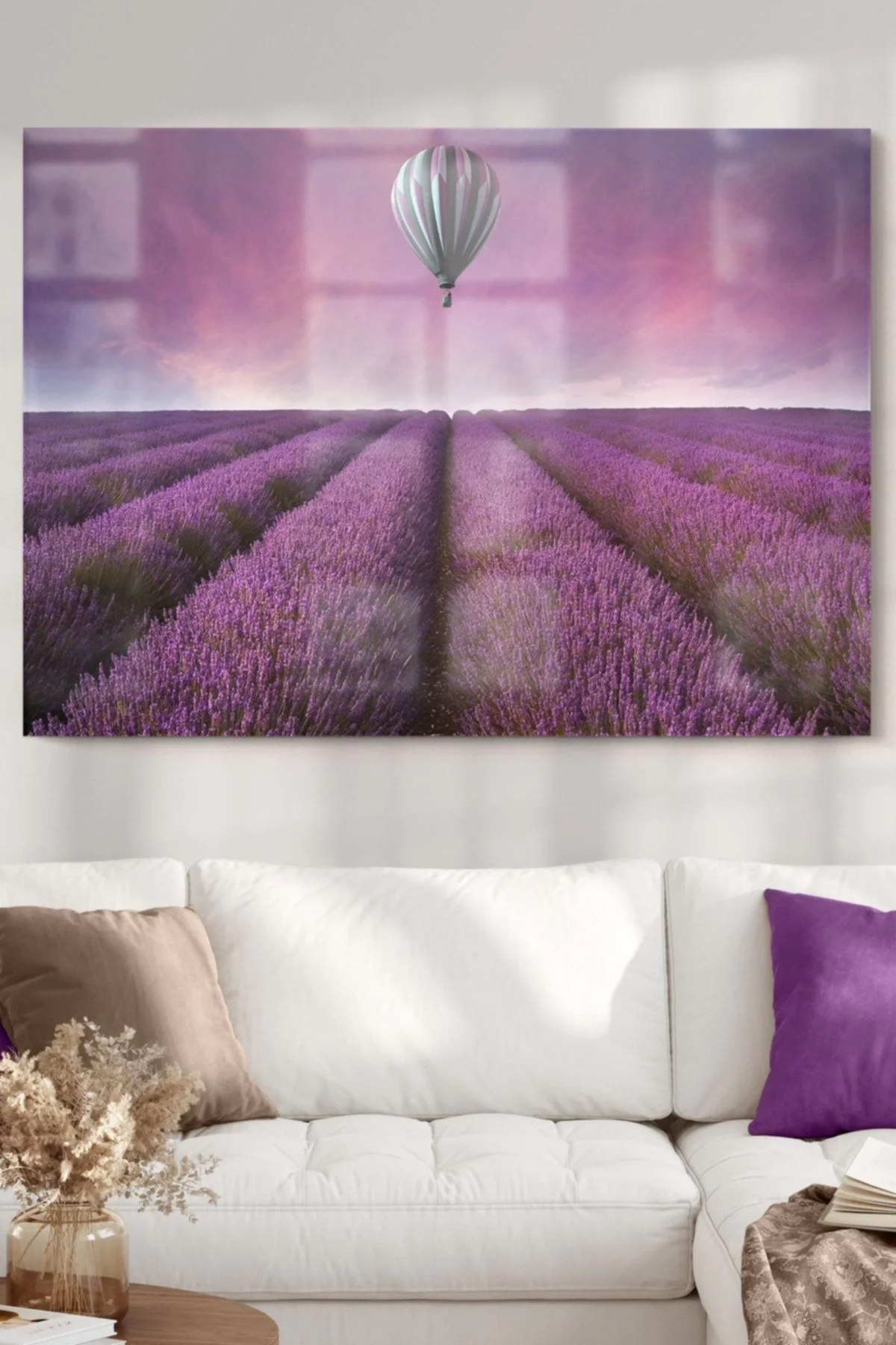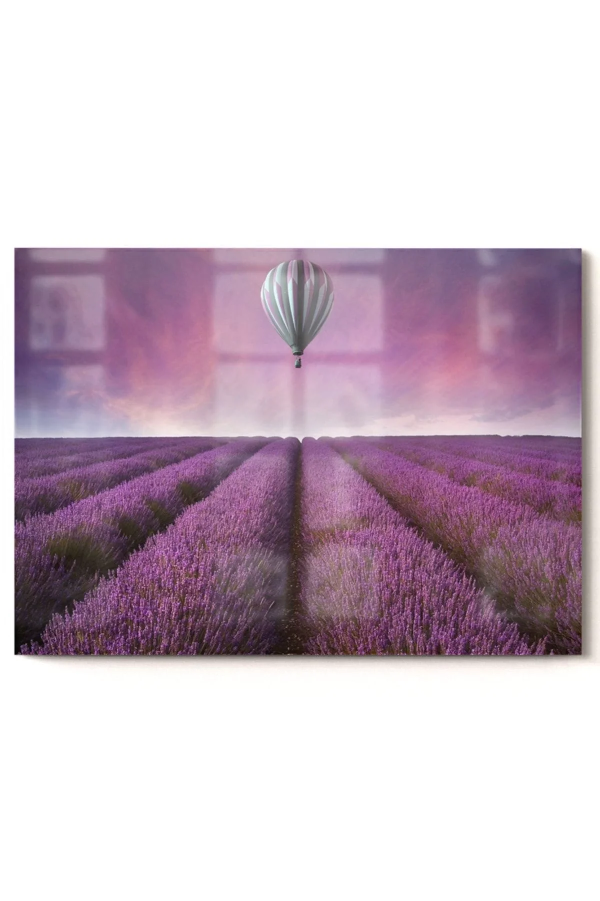 Lavender Field and Flying Balloon | Landscape Themed Glass Painting | 50x70cm