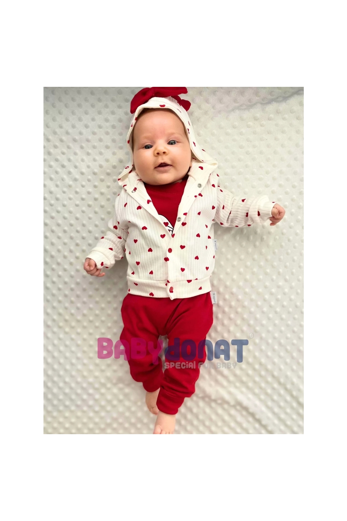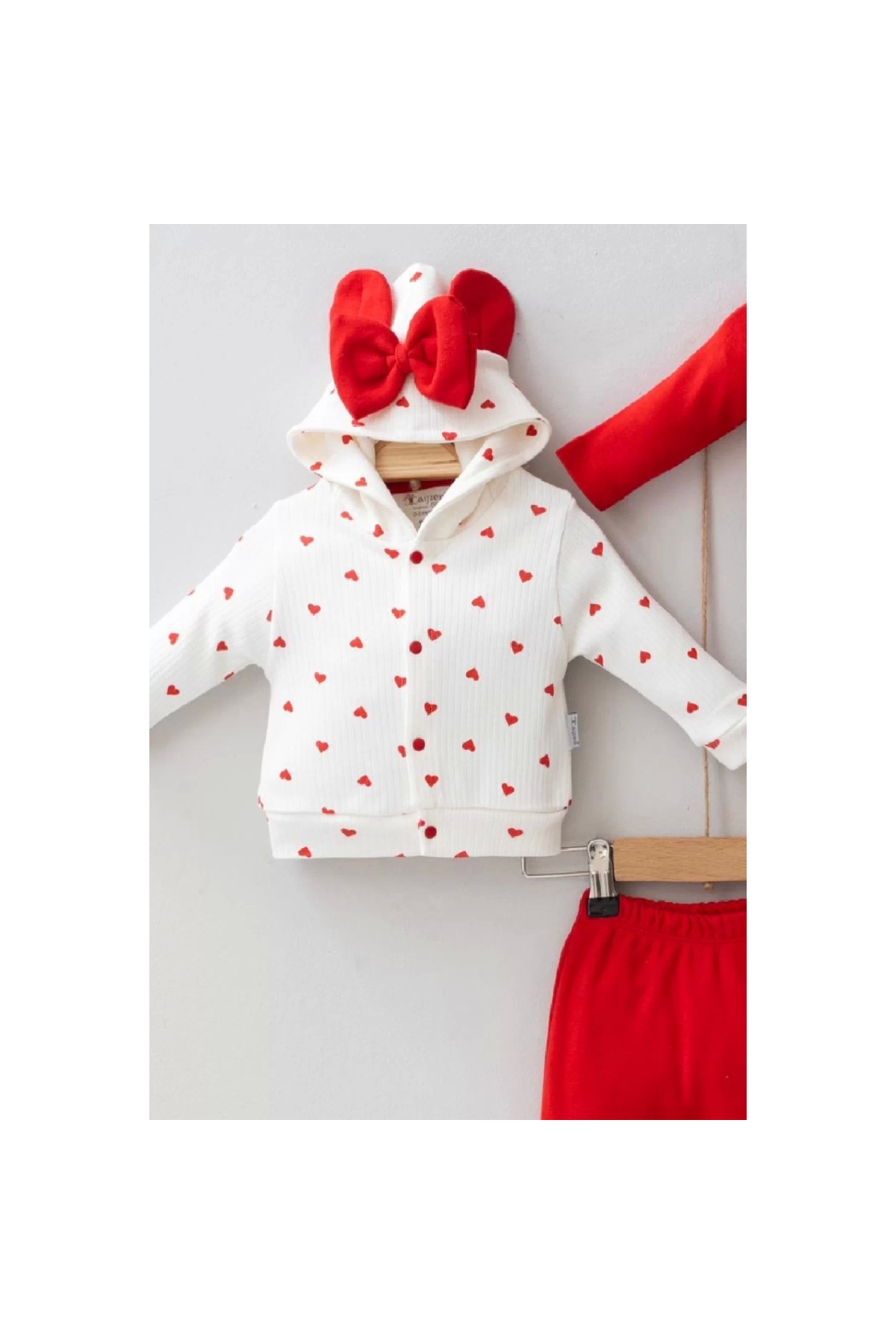 The product is 100% Cotton. It is in a set of 3. His cardigan has a Mickey Accessory Hoodie. Made in Turkey. It will be sent with Beruflic Label.
