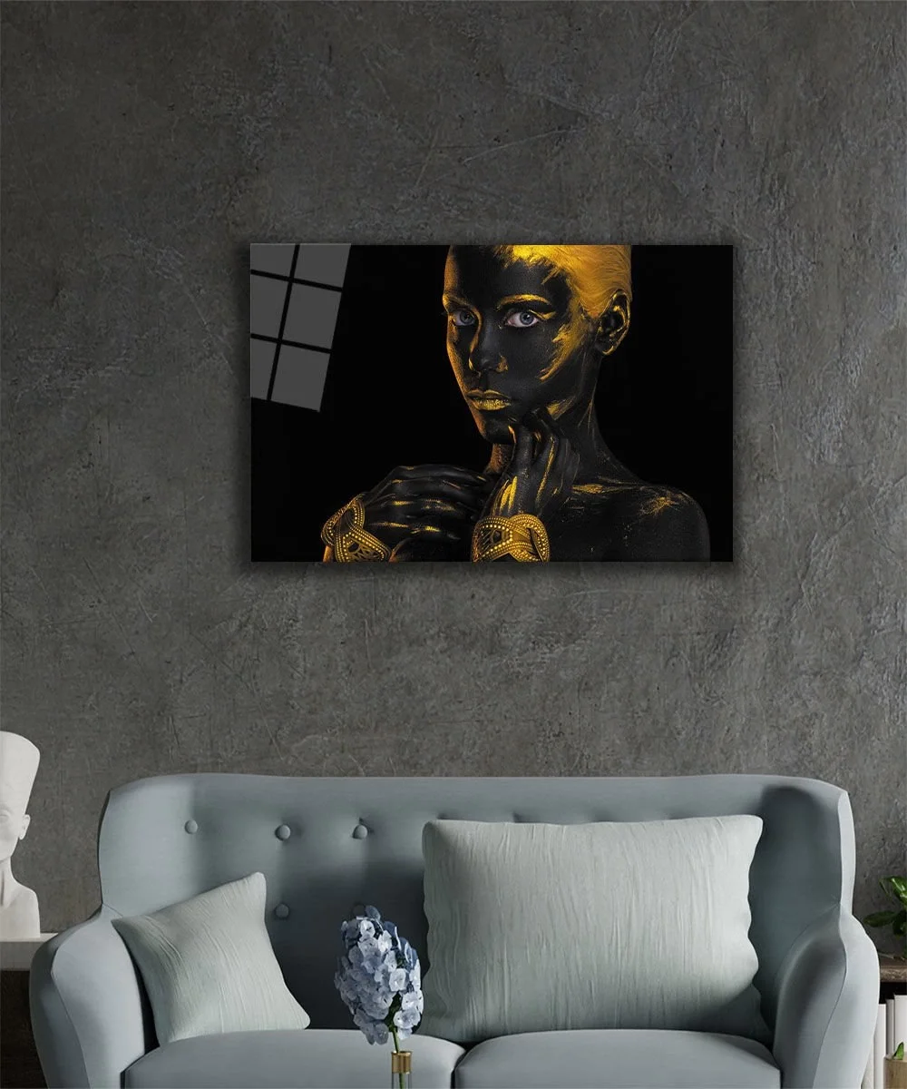 TEKNOO- Glass Painting of Woman with Black Golden Hair, Make-up and Jewelry
