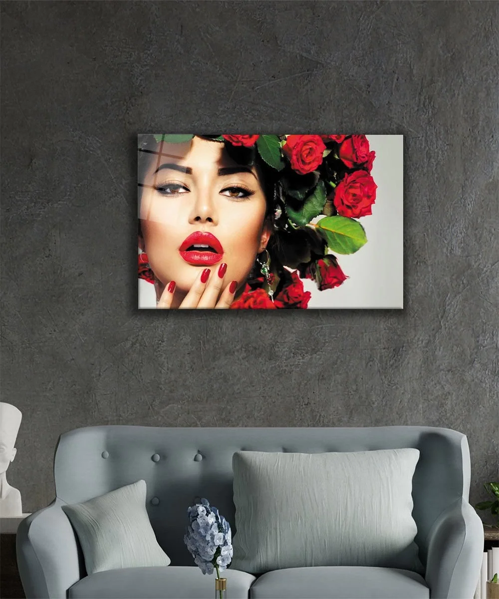 TEKNOO- Woman with Rose Hair and Red Lipstick Glass Painting