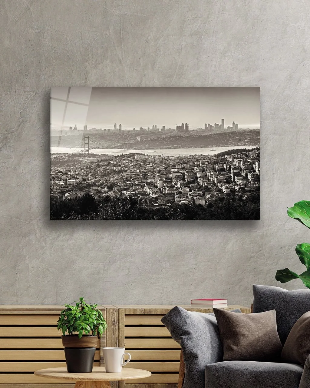 Black and White Glass Painting with a Bird's Eye View of Istanbul