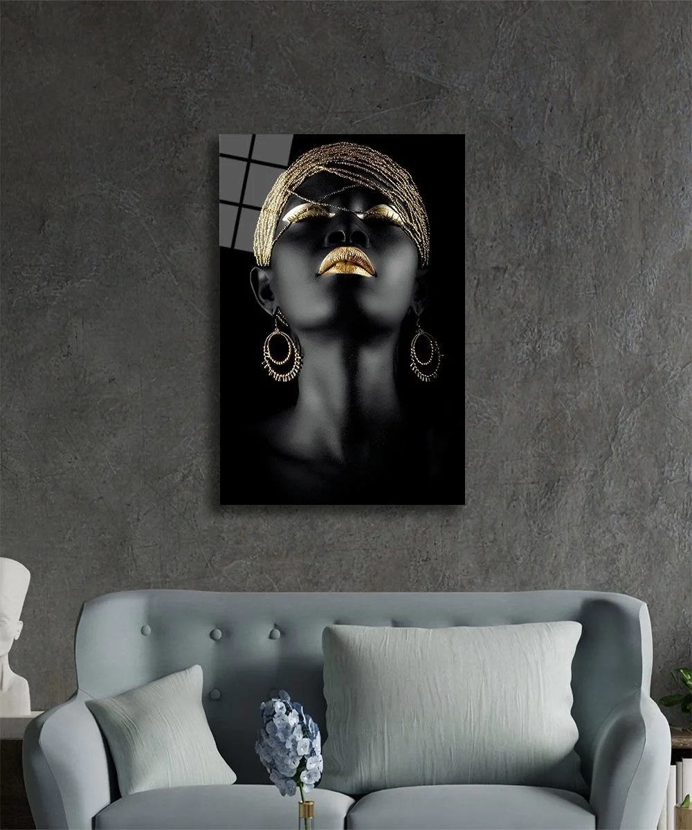 African Woman with Golden Hair, Lips and Eye Makeup, Glass Painting