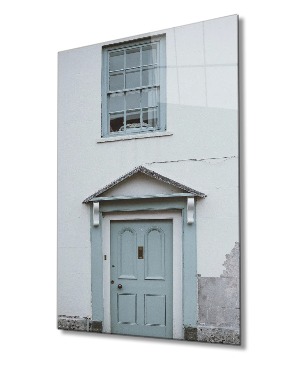 TEKNOO- Vertical Glass Table with Turquoise Wooden Door and Window Visual with Triangular Roof