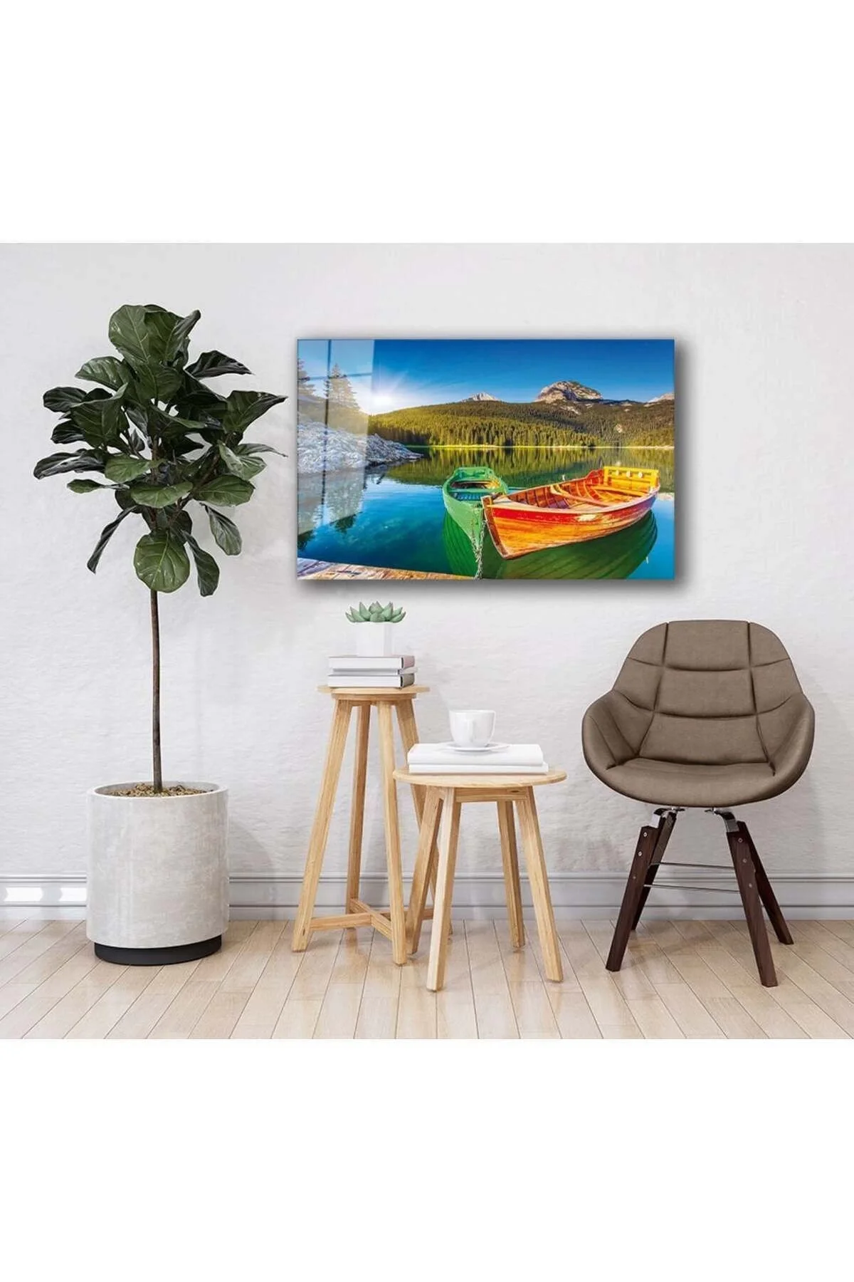 Landscape Boat Lake And Mountain Glass Painting Home And Office Wall Decoration