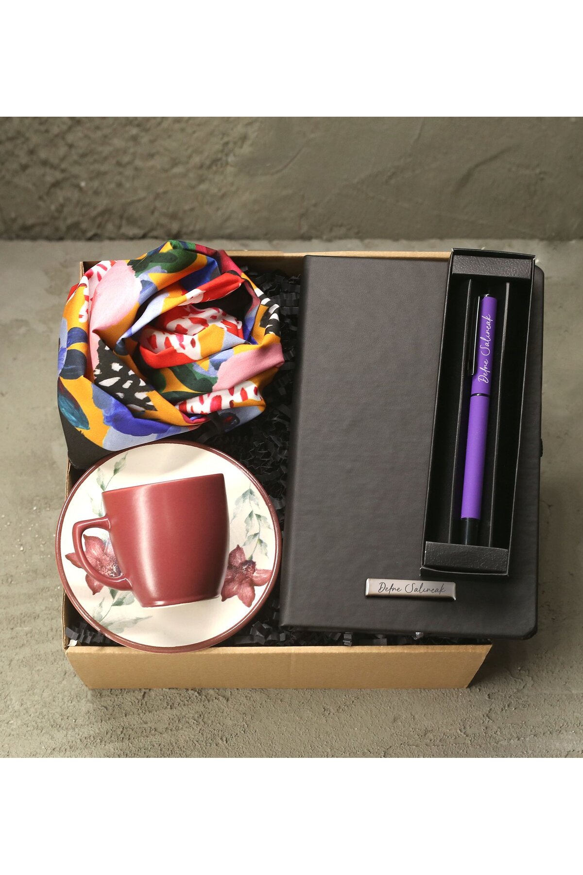 PRODUCT CONTENT Personalized Black Notebook *It is personalized. It is made by laser engraving method. The writing is not erased or deformed in any way. *It consists of 192 pages. *Pages are lined. *There is a safety and pen rubber band. *Size: 13 X 21 cm. Personalized Purple Metal Rollerball Pen *It is personalized. It is made by laser engraving method. The writing is not erased or deformed in any way. *It is written in blue color. *Sent in a pencil case. *Size: 12 cm. Colored Coffee Cup *This stylish set with its unique matte color and magic pattern will add a completely different atmosphere to your presentation. In addition, this product, which has an original design, will be a nice and pleasant gift. *Material: Ceramic *Size: Height 6.5 cm - Mouth Diameter: 6 cm *Capacity: 95 ml Colorful Scarf *Silk satin scarf in dimensions 50 x 50. It can be used for multi-purpose. (Bracelet, Neckband, Bag Accessory, Hair Band, Headband, Buckle, Crown, Handkerchief etc.). It is suitable for all ages.