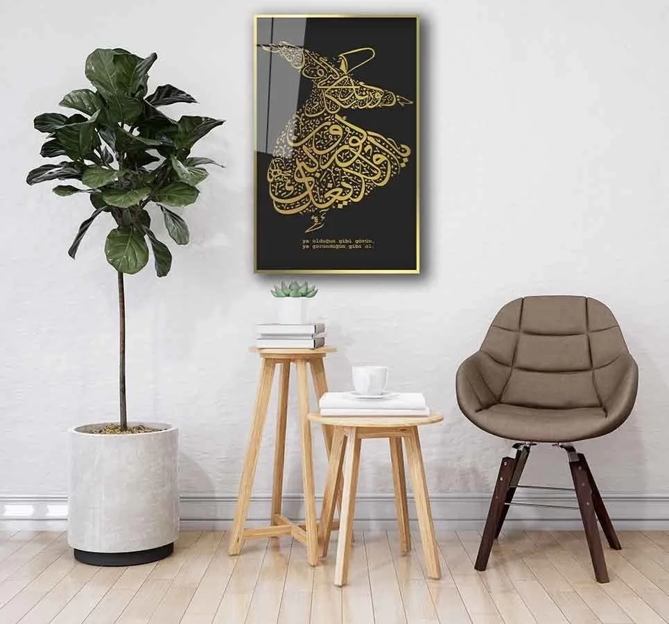 TEKNOO- Mevlana Whirling Dervish Yellow Black Glass Painting
