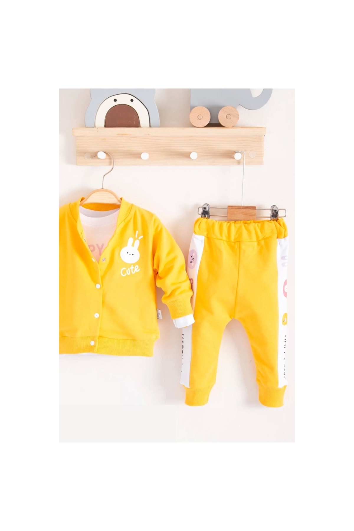 Cute Funny Patterned Hooded Cotton 3-Piece Baby Girl Set. The product is produced in Turkey, from skin-friendly fabric.