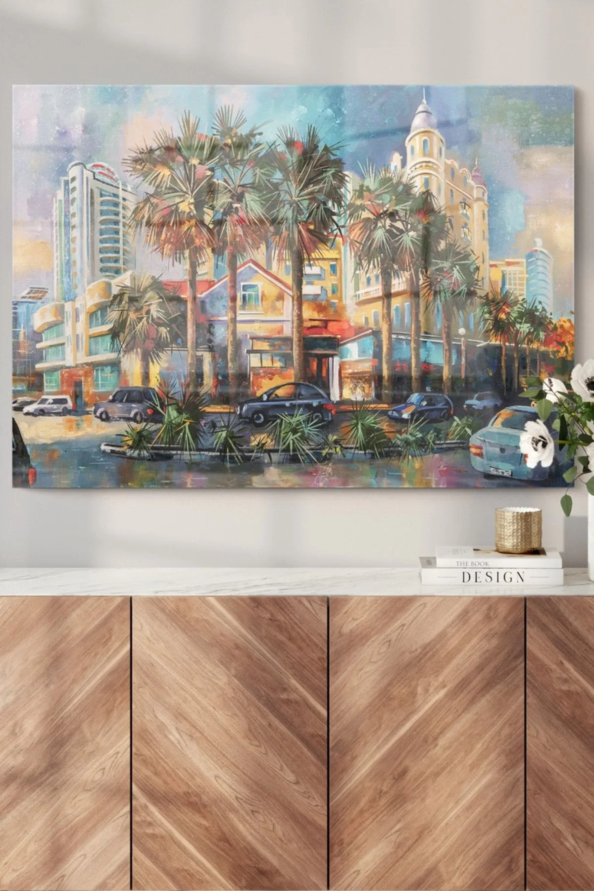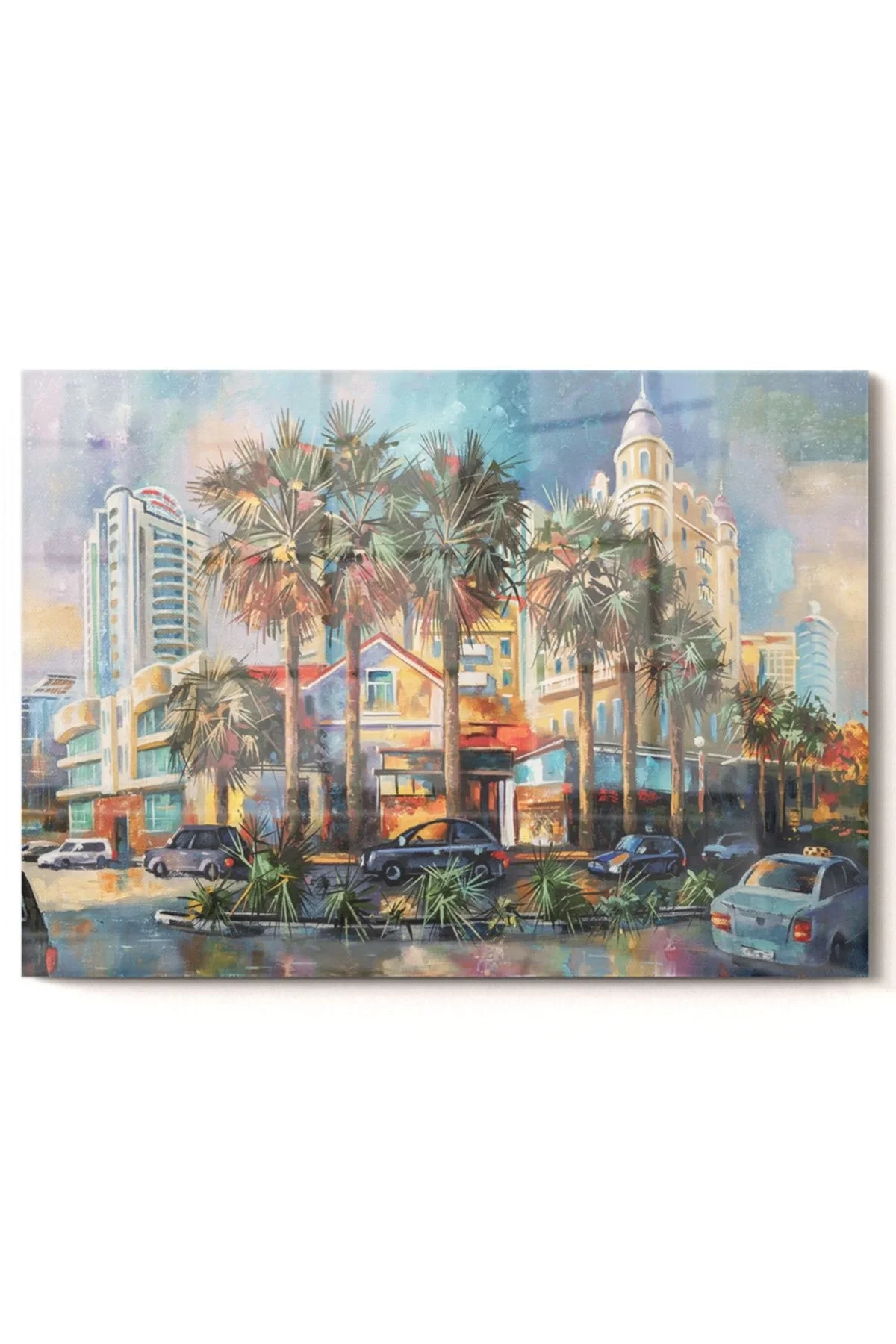 Palm Trees And The City | City Themed Glass Painting | 50x70cm