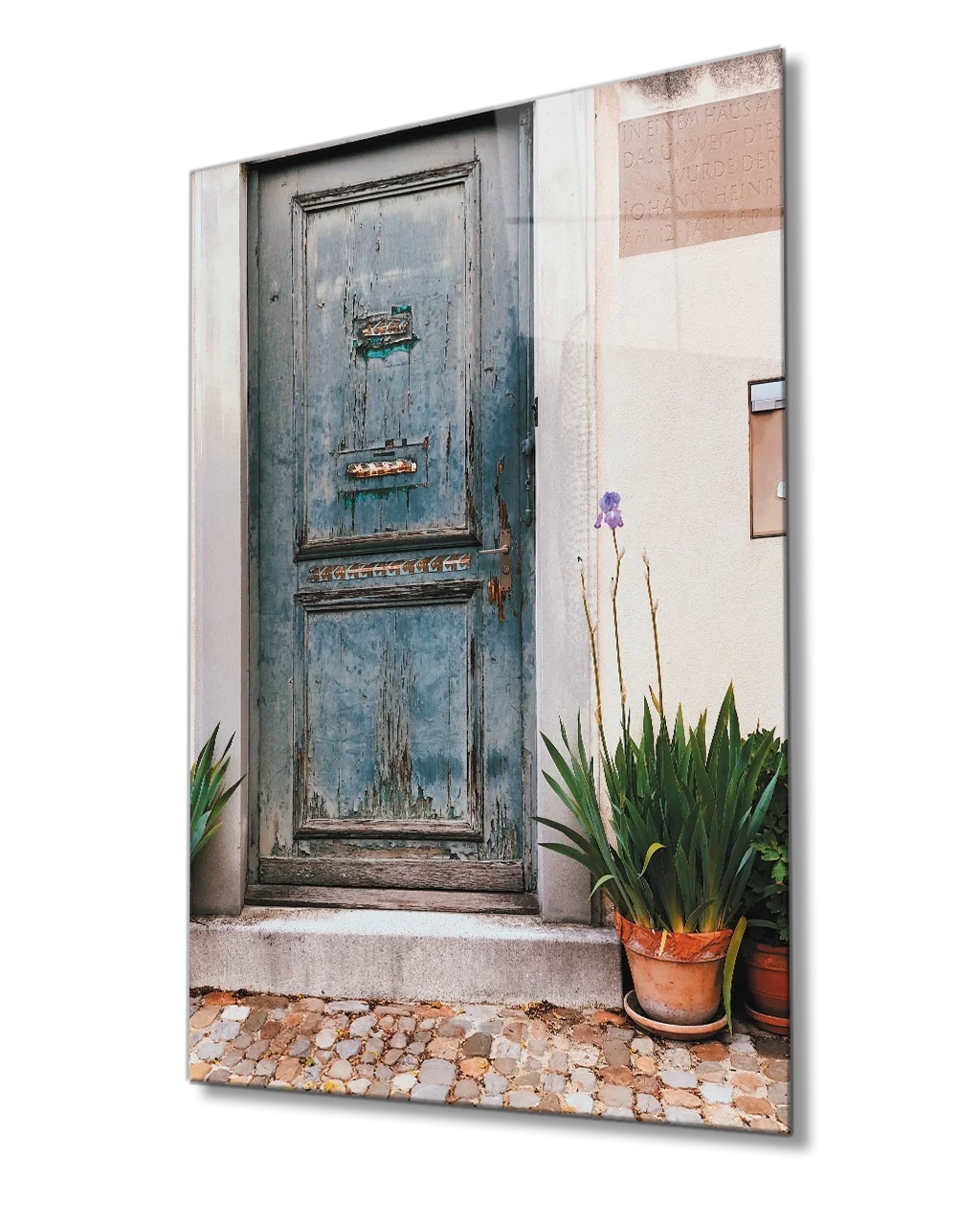 Vertical Glass Painting with Blue Old Wooden Door Image