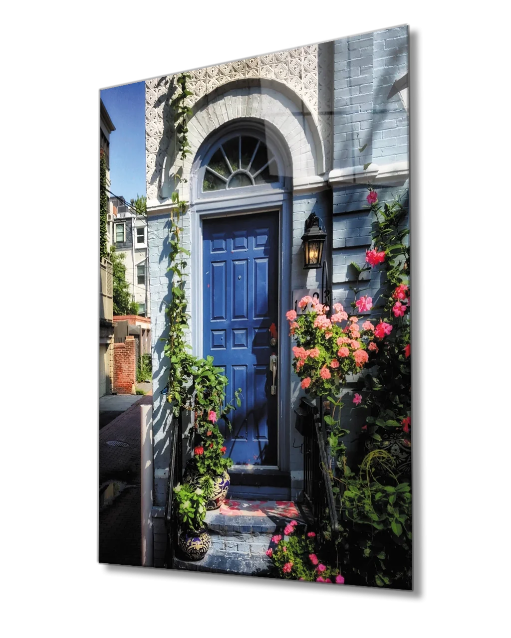 Vertical Glass Painting with Flowers and Blue Arched Door Image