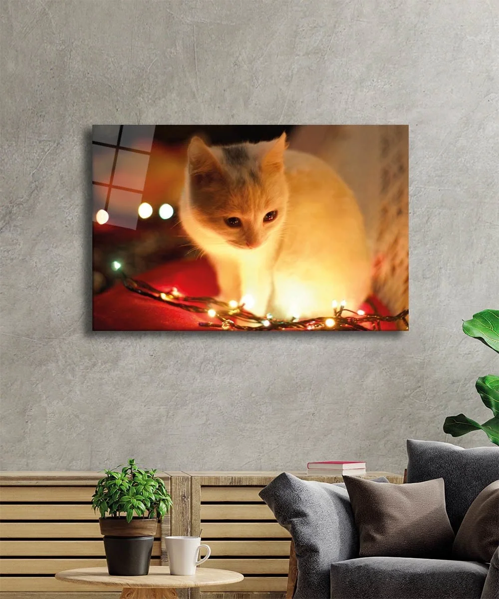 TEKNOO- White Cat and Yellow Light Glass Painting Yellow Cat and Lights
