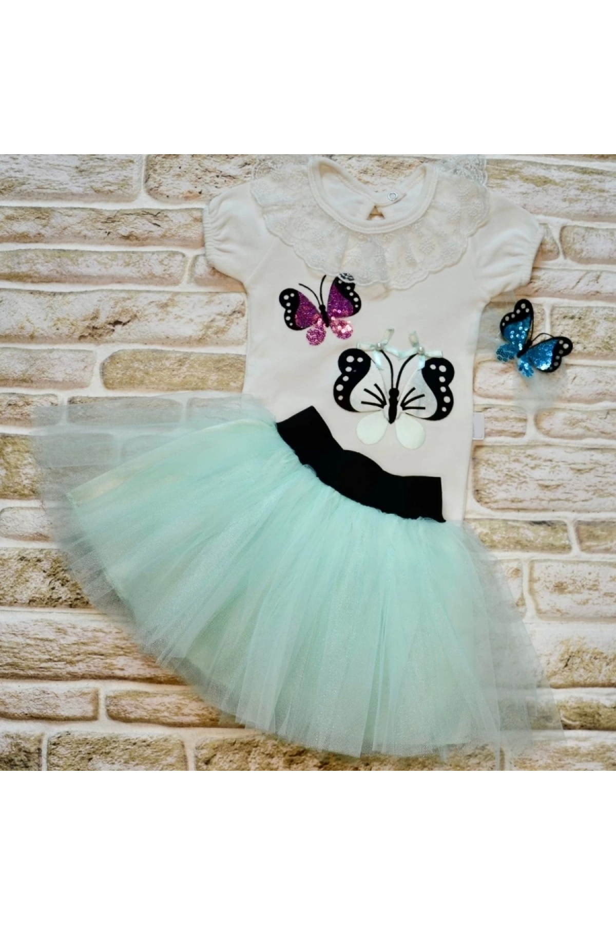 9-12-18 Months Sequined Butterfly Embroidered Crowned Short Sleeve Tutu Skirt 3-Piece Baby Girl Set