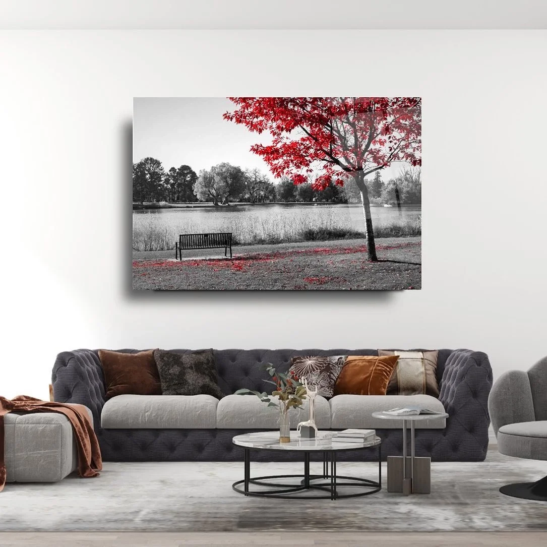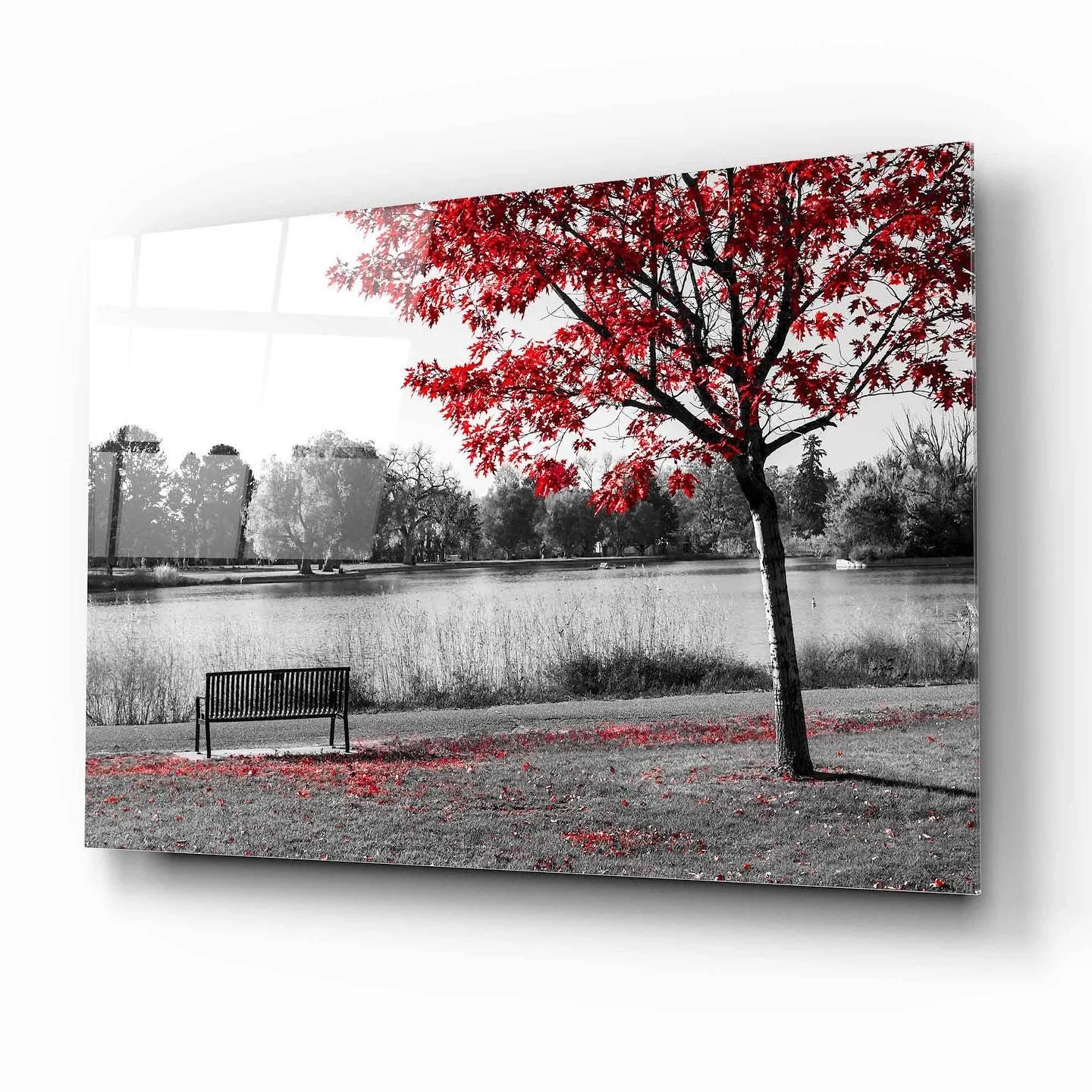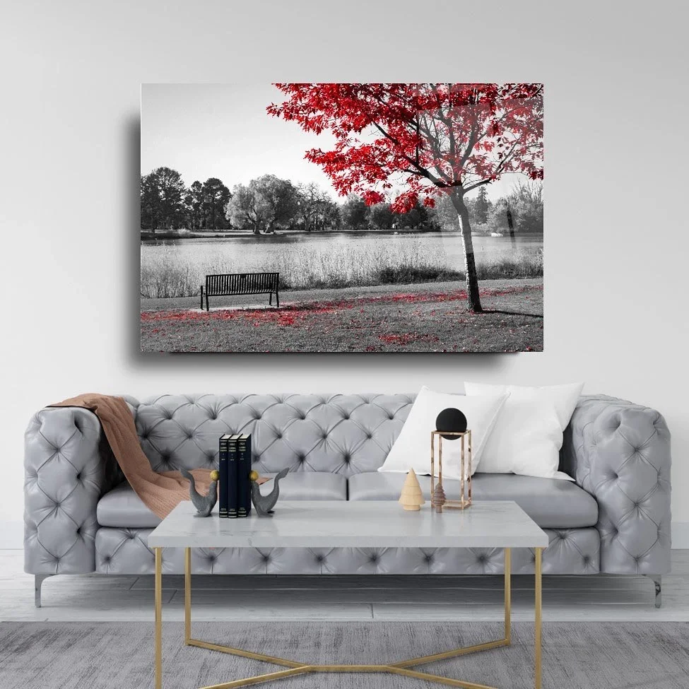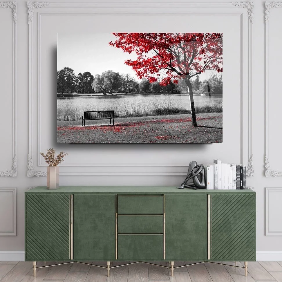 Red Leaf Landscape and Bench Artistic Glass Painting