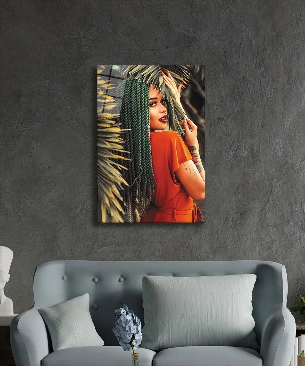 Glass Painting of Woman with Afro Hair Among Palm Trees