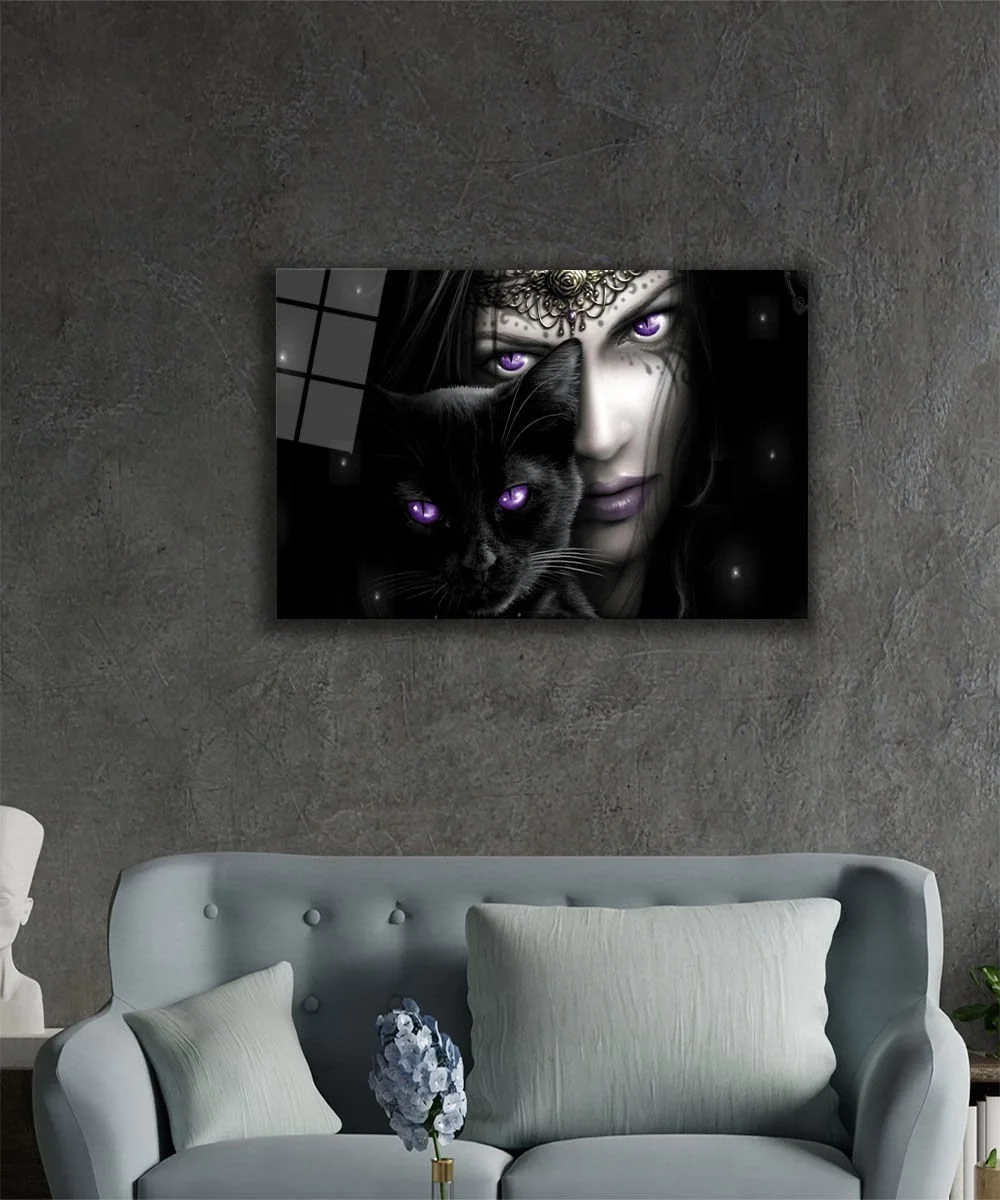 Fantasy Woman Black Cat Purple Eyes Glass Painting