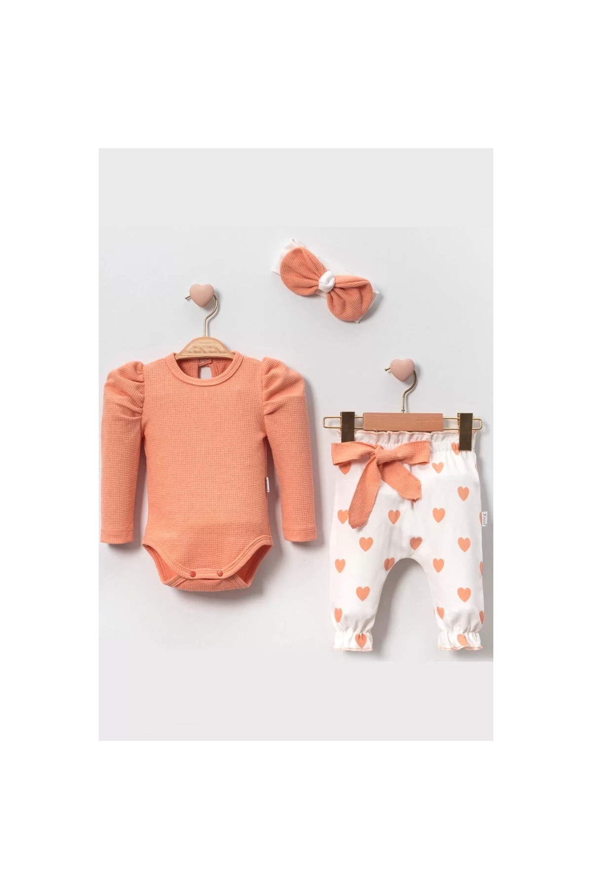 3-Piece Luxury Waffle Baby Girl Set with Heart Printed Bandanas. The product is produced in Turkey from skin-friendly fabric.
