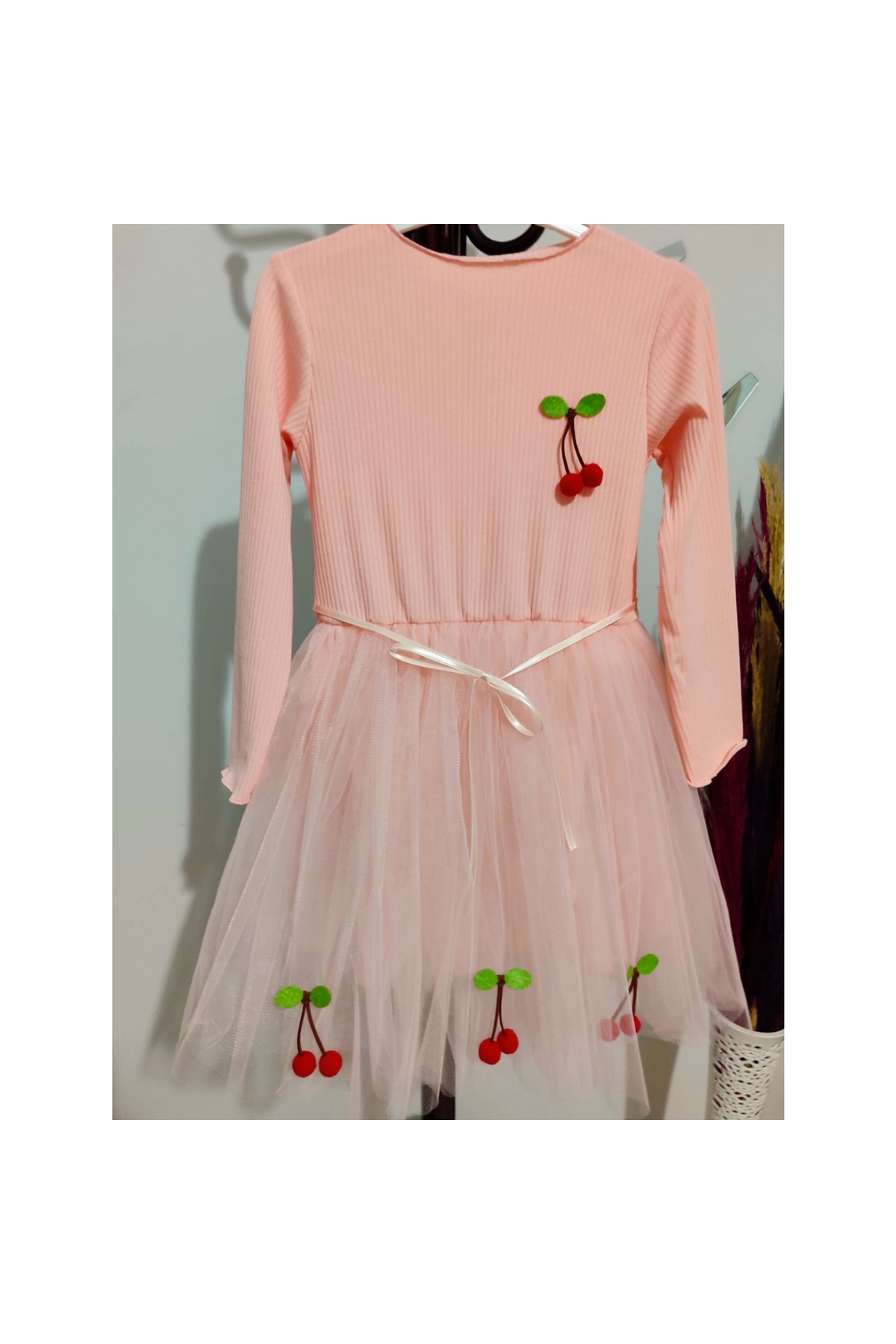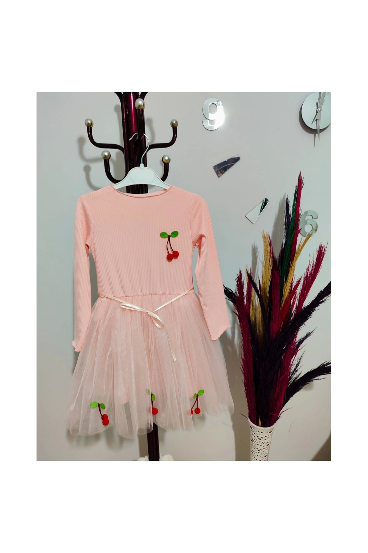 5-6-7 Years Old Cherry Patterned Ribbon Belted Lined Long Sleeve Girls Tutu Dress