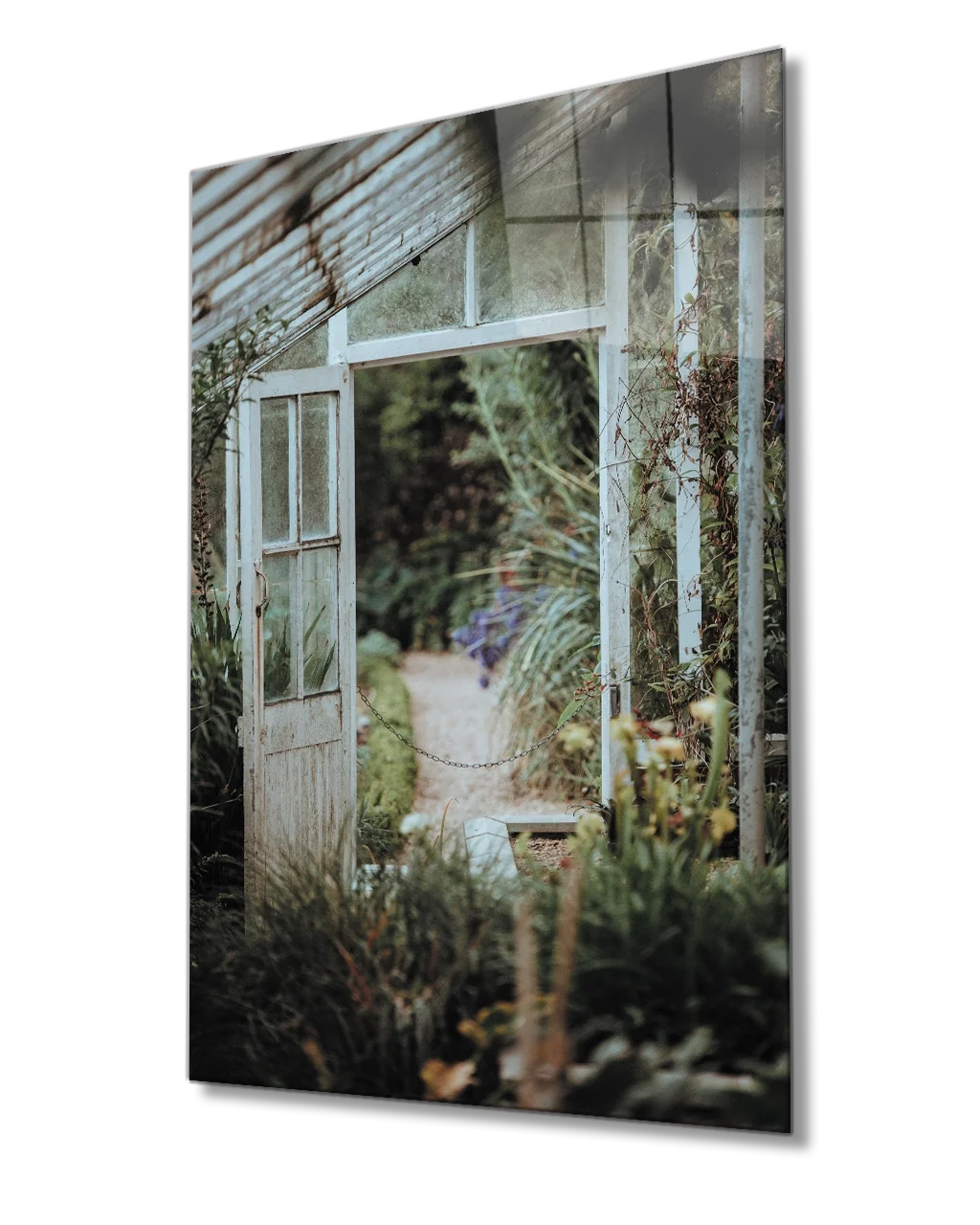 TEKNOO- Vertical Glass Painting with White Wooden Door and Garden Image