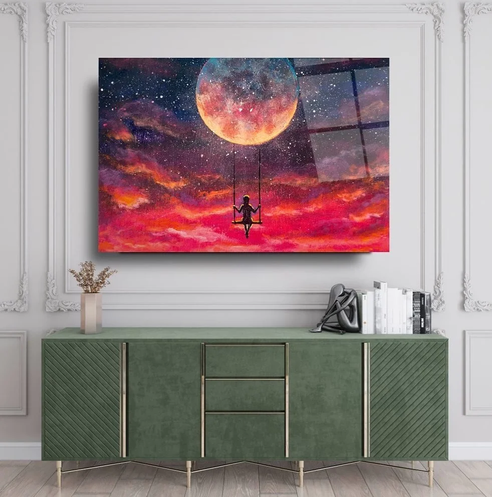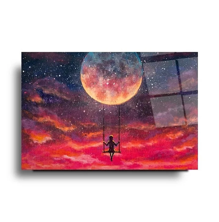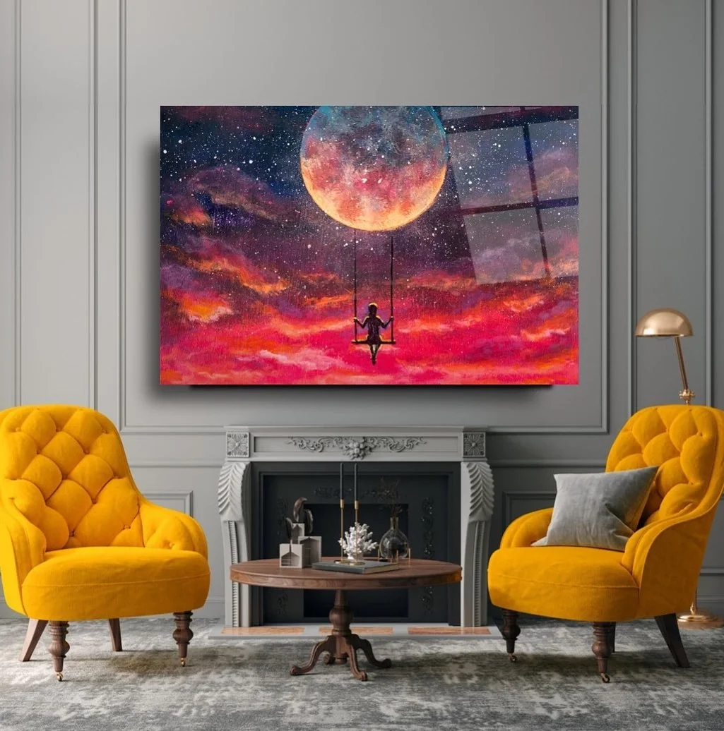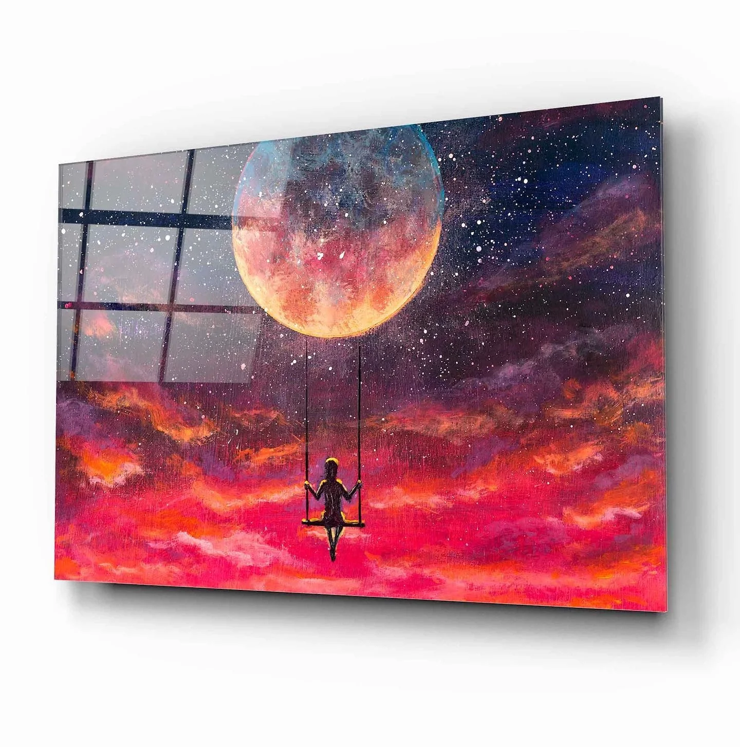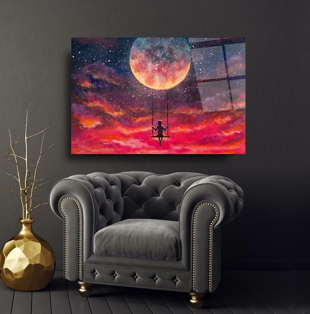 Artistic Glass Painting of Woman on a Swing on the Moon