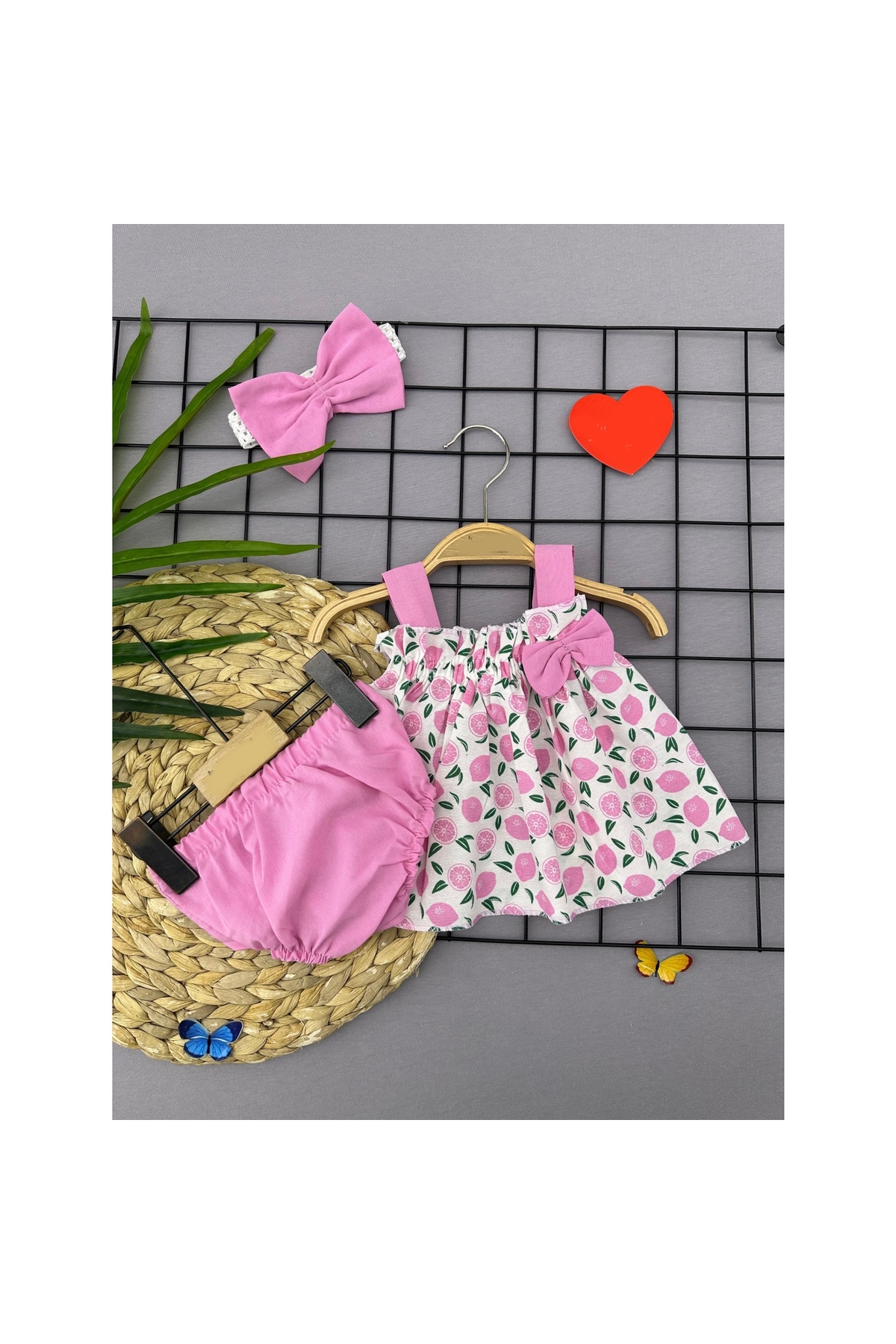 3-6-9-12 Months 3-Piece Baby Girl Dress with Bandages and Panties, Fruit Pattern and Straps