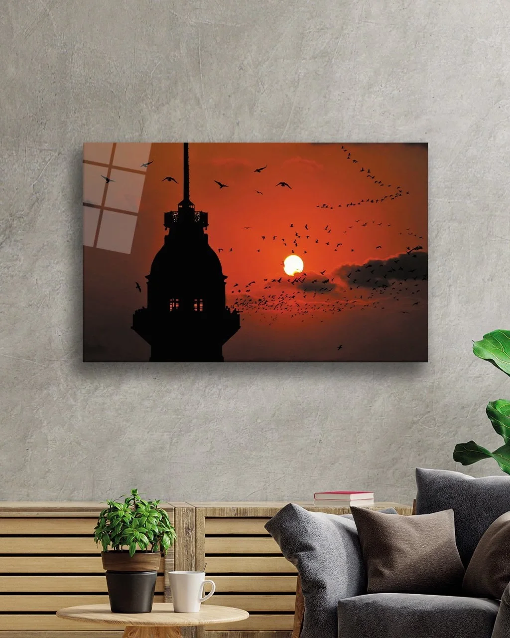 Istanbul Maiden's Tower at Sunset Seagulls Glass Painting