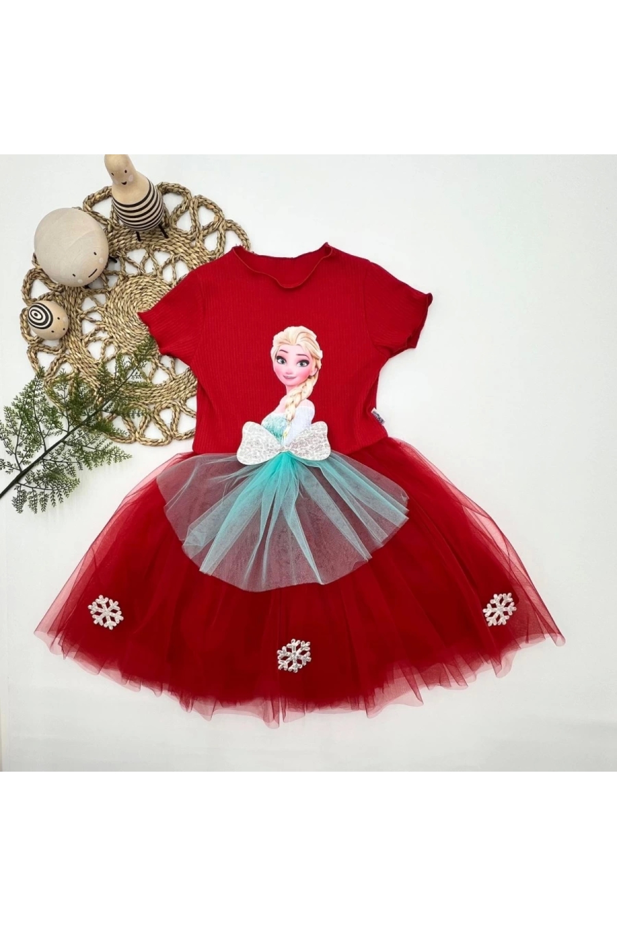 5-6-7 Years Old Elsa Patterned Bow Tulle Skirt Lined Short Sleeve Girls Tutu Dress