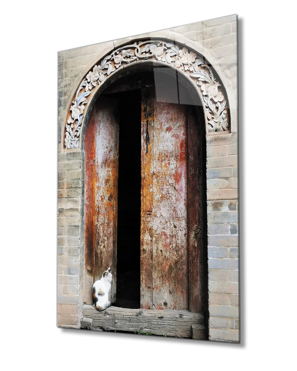 Carved Stone Arched Wooden Door and Cat Glass Table
