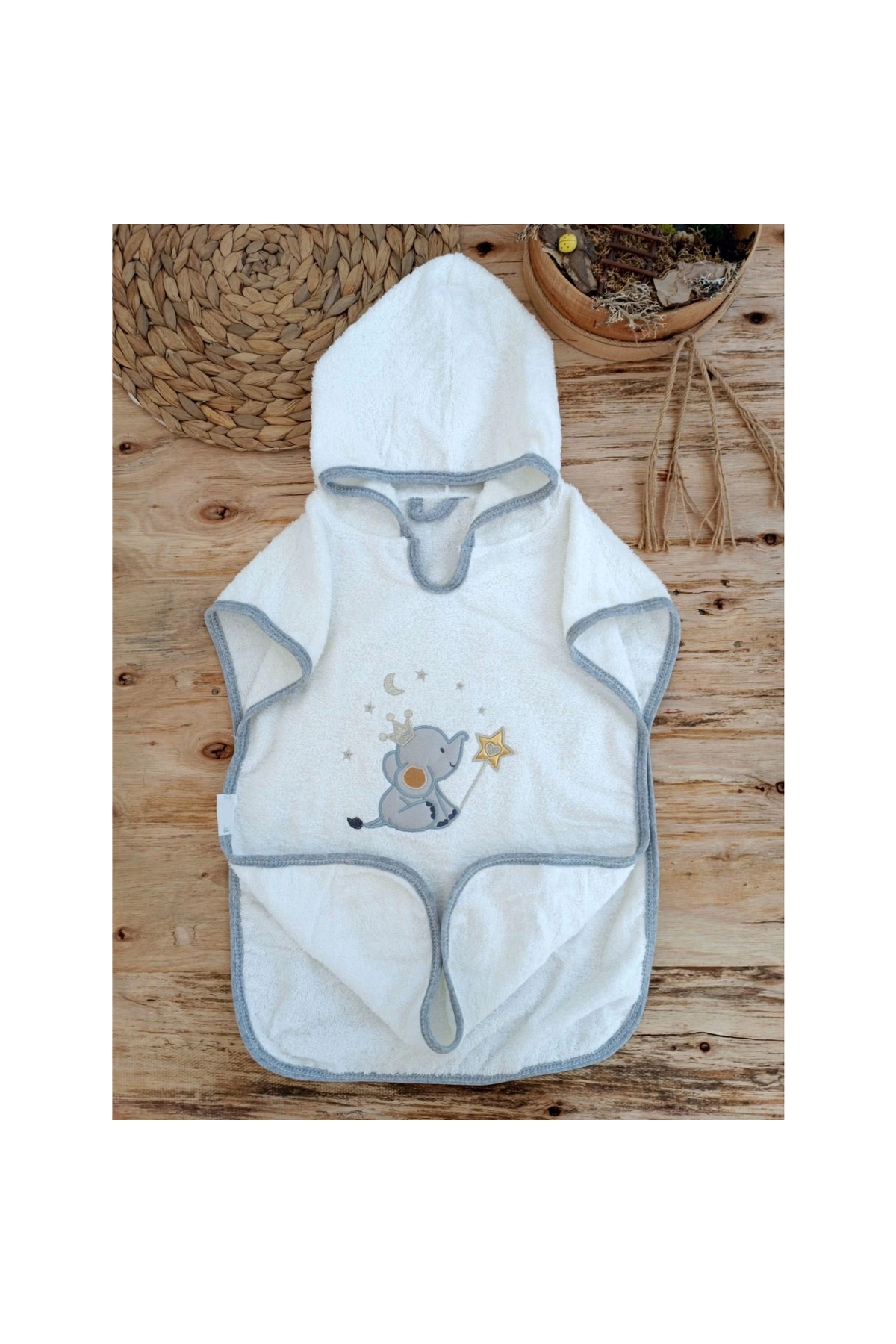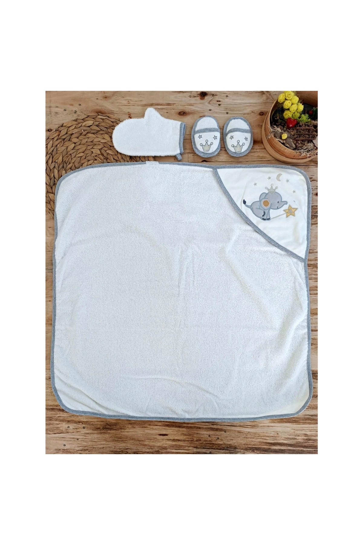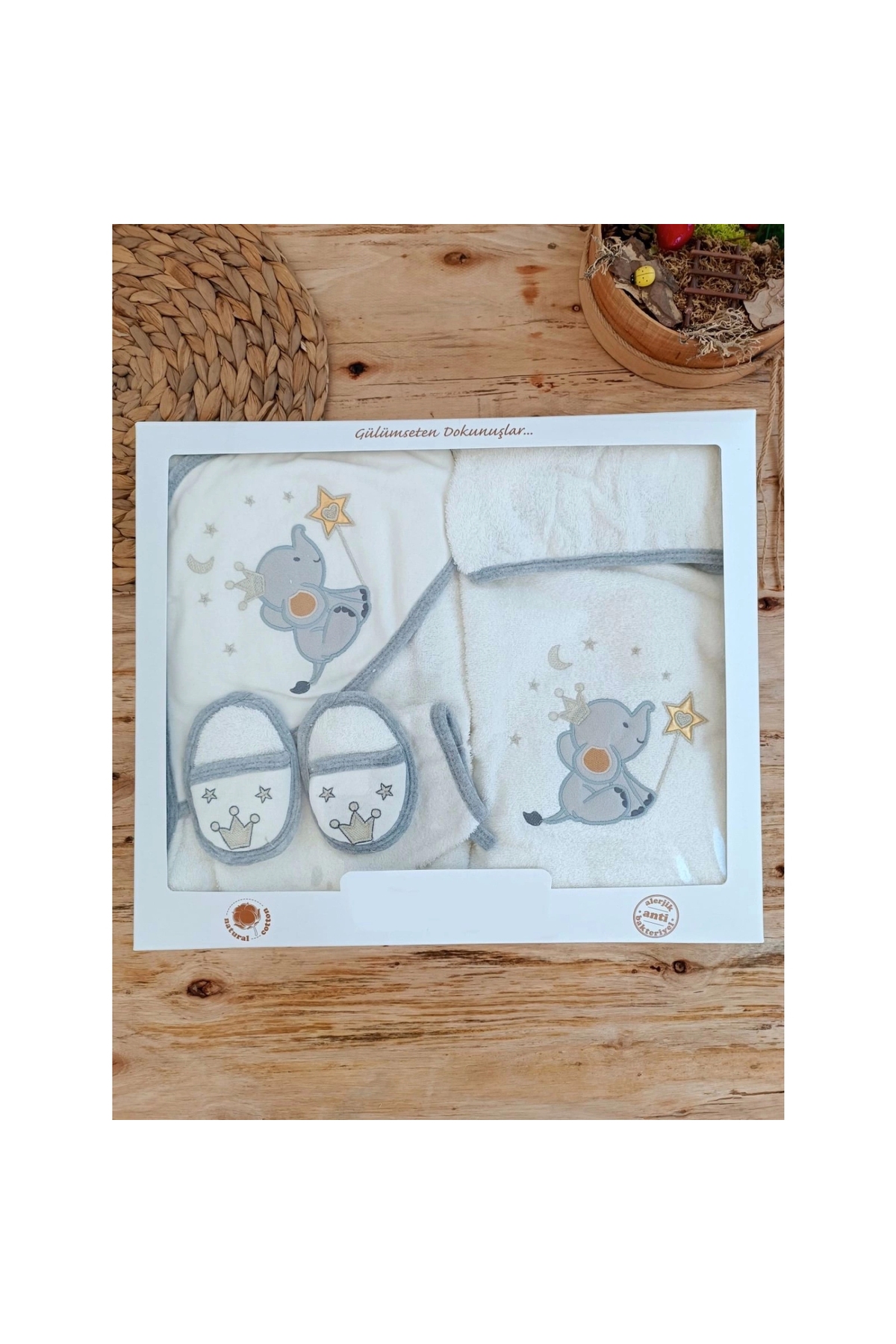 Natural Anti Allergic; Made from 100% cotton fabric.; It does not harm the skin with its soft texture.; All parts that come into contact with the baby's skin are made of cotton; It is made of special blend cotton fabric that provides high water absorbency.; Can be used between 0-1 years old.; BOX CONTENTS;; 1-Hooded Bathrobe 2-Hooded Bath Towel 3-Slippers 4-Bath Washcloth