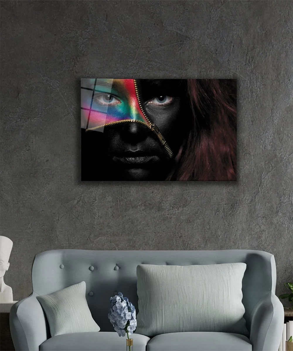 TEKNOO- Woman Face Glass Painting with Zipper Undressing from Black and Opening to Colors