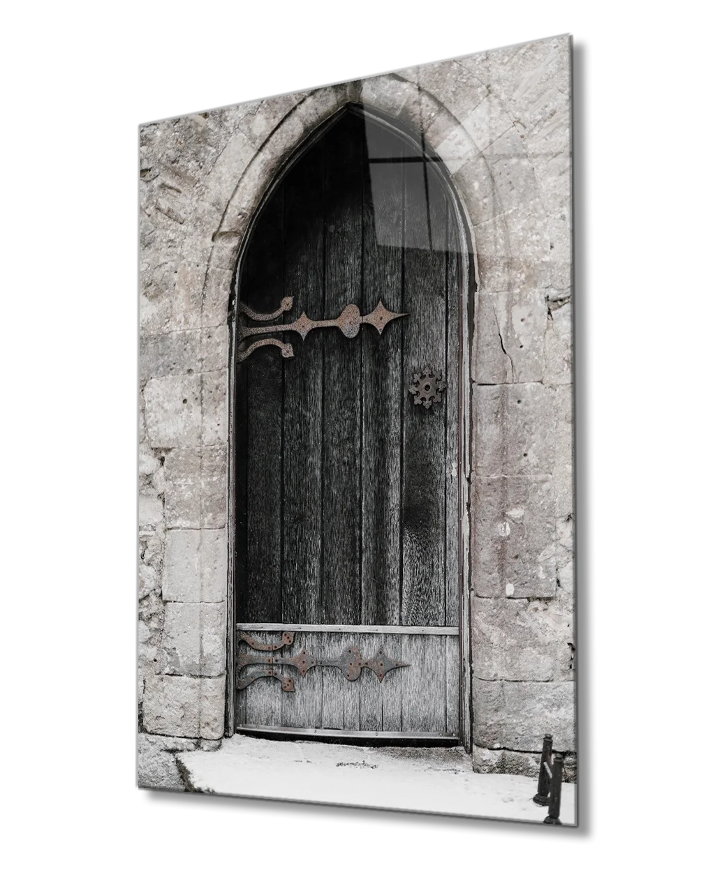 TEKNOO- Vertical Glass Painting with Images of Stone Walls and Wooden Doors with Iron Motifs