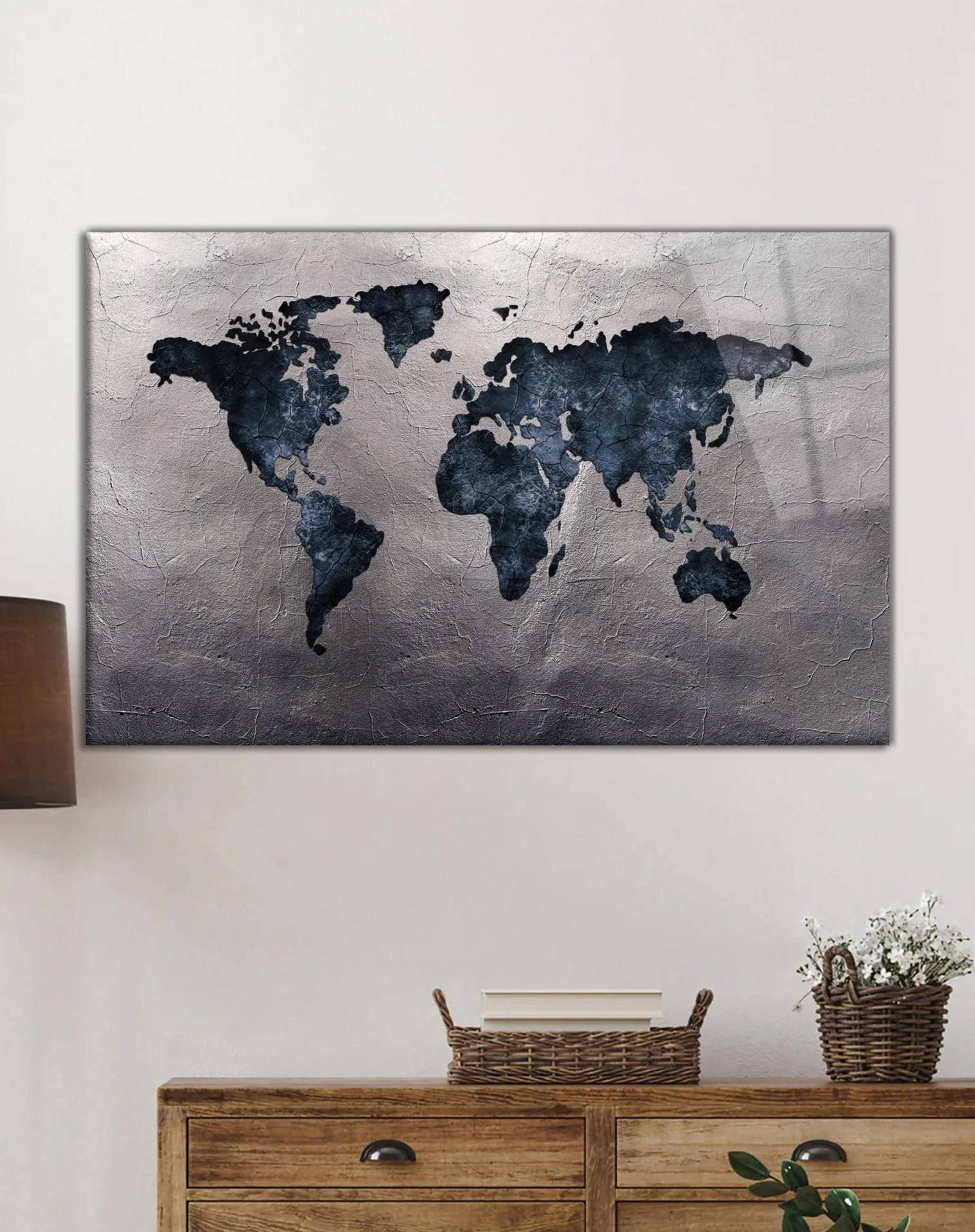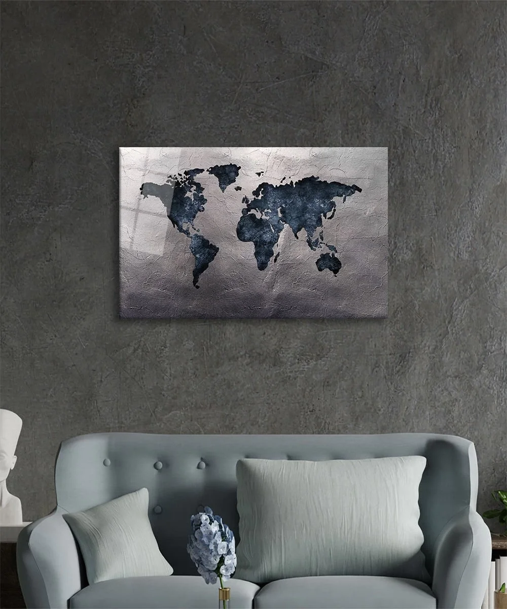 TEKNOO- Gray Antiqued World Map Glass Painting Home and Office Wall Decoration