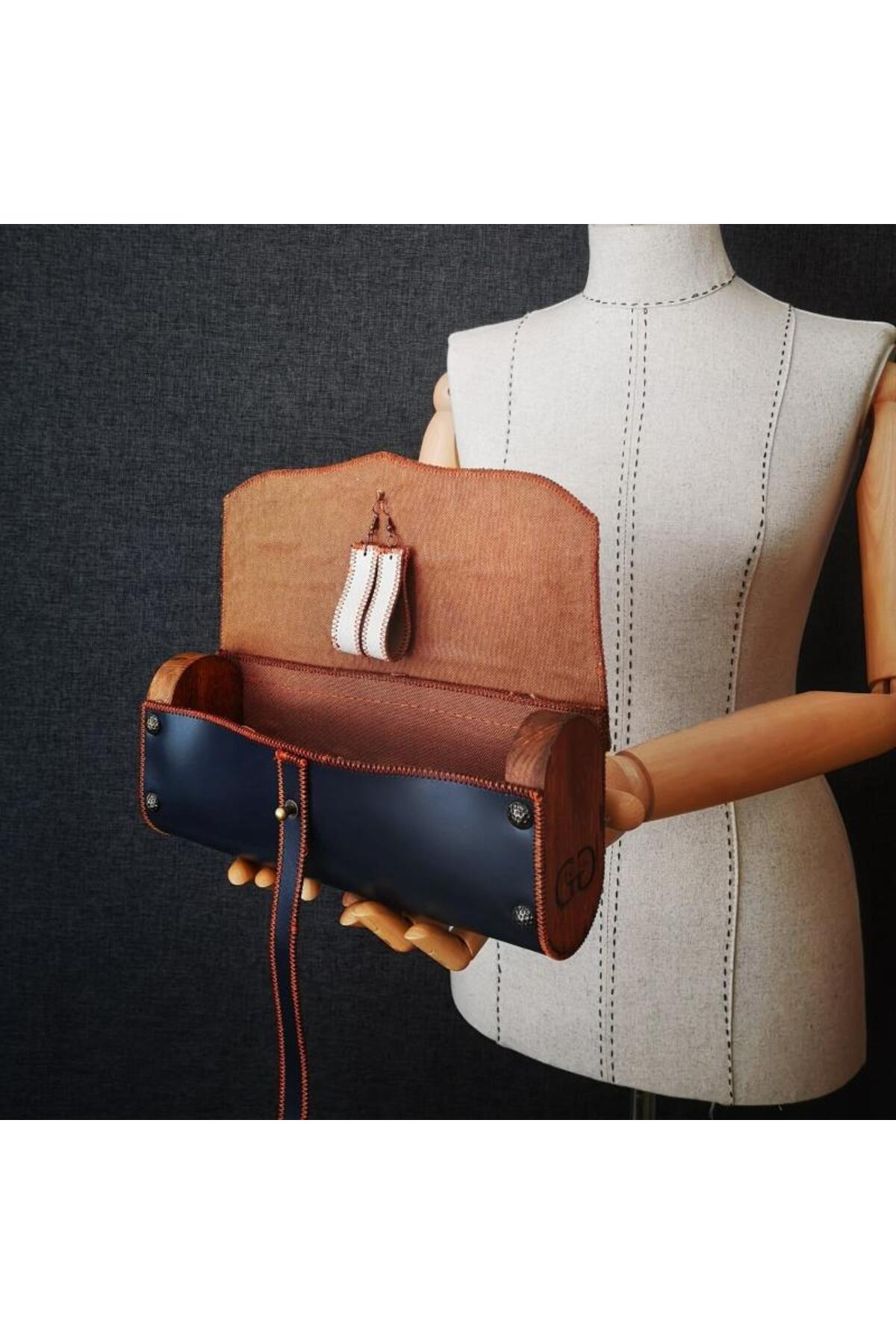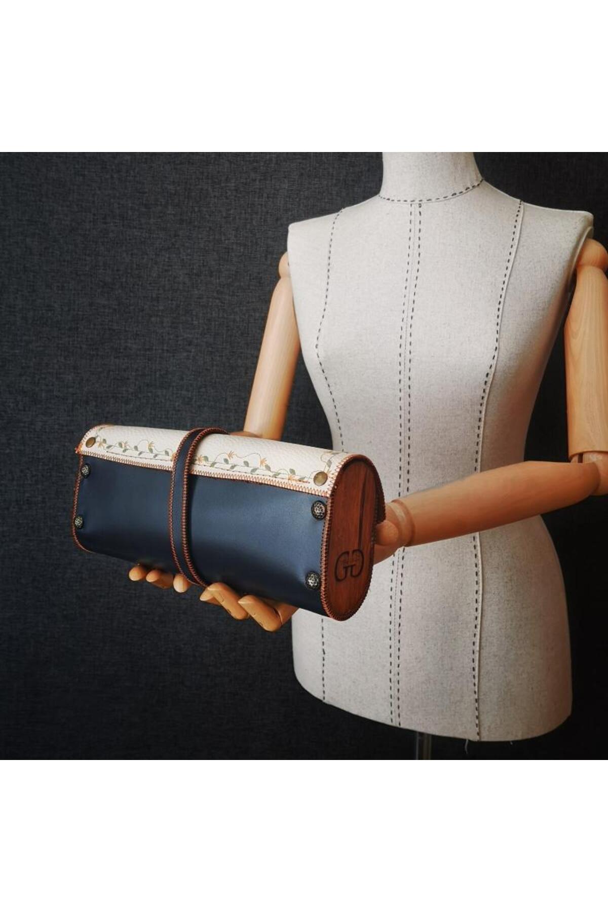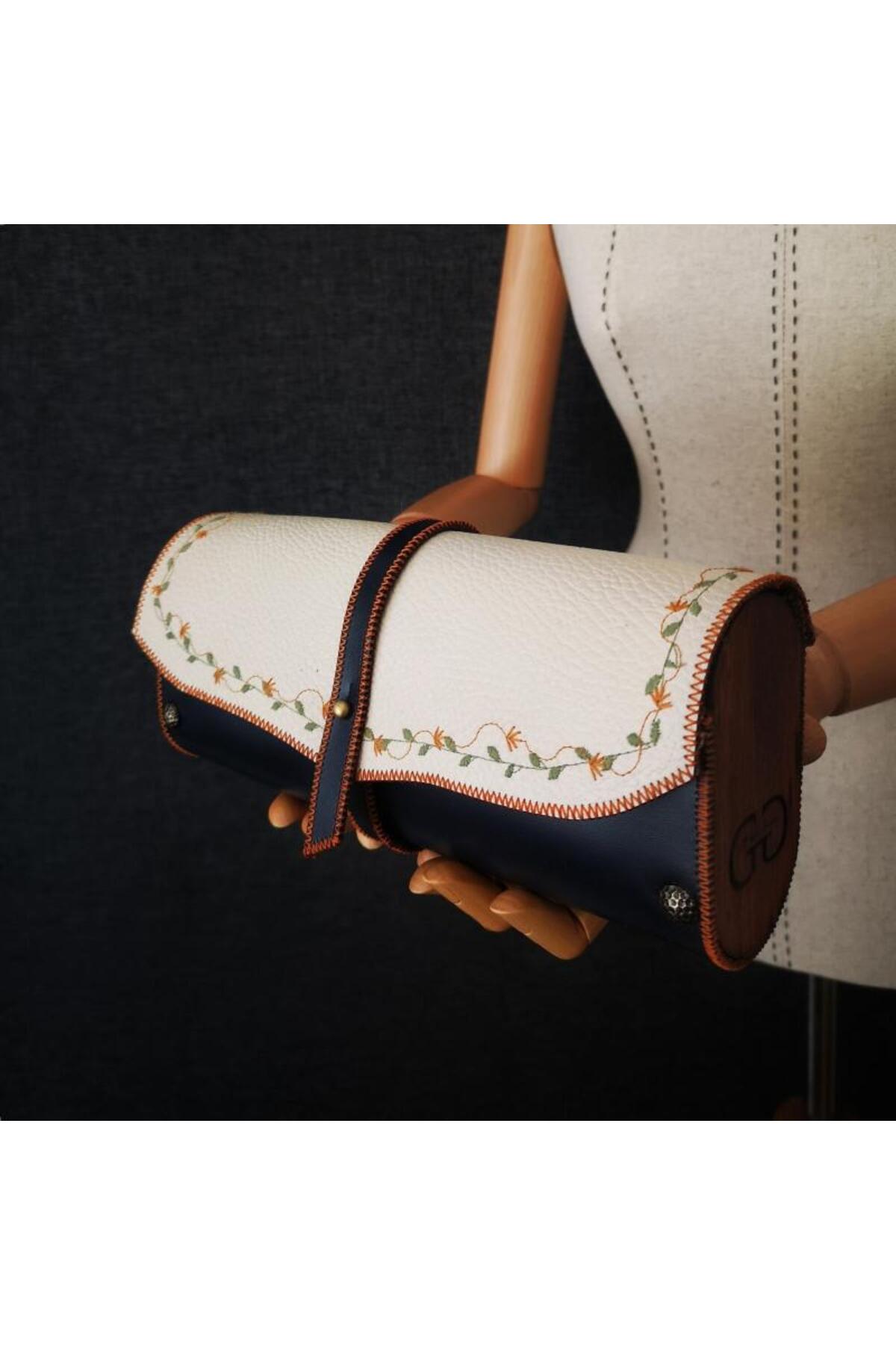 GENUINE LEATHER HAND MADE BAG - LARISSA FEATURES - Our products are produced using top quality Genuine Leather (Crazy, Vegetal) and with 100% Hand Labor in a warm house converted into a workshop. - The edges of the designs are sewn by hand with a 1950 model PFAF brand sewing machine and overcasting is done to prevent edge fraying. - Each of our bags has embroidery on leather using a high-end embroidery machine from PFAF brand. All of our embroideries are embroidered with ANCHOR brand embroidery threads. - The inside of our bags, the reverse side of the leather, is covered and closed with Scottish Linen in accordance with the design. - Wooden Edges are manufactured from BB – BC Quality Solid Panel or Ireko Wood Solid Panel. - Brass Behçi is used on the product cover. It is nailed from the front and back with patterned ribs and glued to the wooden material beforehand. - The products are packaged in a cardboard box specific to their size, wrapped in white tissue paper and closed with a wicker rope, and the box is filled with scraps. The cargo is delivered to you with a presentation in the style of a gift package. - DIMENSIONS 23cmX10cmX5.5cm The product has the volume and width to accommodate a mobile phone, wallet, business card holder and various make-up accessories.