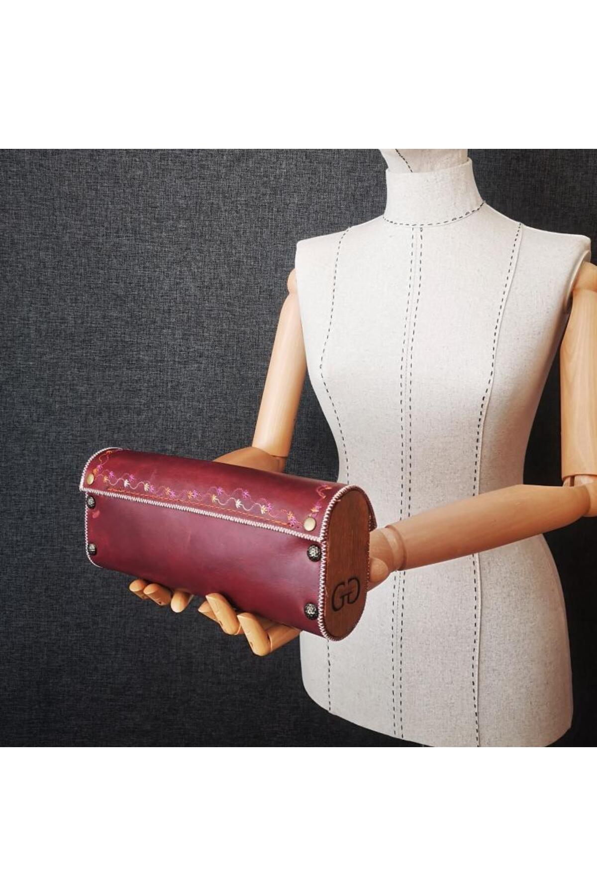 GENUINE LEATHER HAND MADE BAG - LARISSA FEATURES - Our products are produced using top quality Genuine Leather (Crazy, Vegetal) and with 100% Hand Labor in a warm house converted into a workshop. - The edges of the designs are sewn by hand with a 1950 model PFAF brand sewing machine and overcasting is done to prevent edge fraying. - Each of our bags has embroidery on leather using a high-end embroidery machine from PFAF brand. All of our embroideries are embroidered with ANCHOR brand embroidery threads. - The inside of our bags, the reverse side of the leather, is covered and closed with Scottish Linen in accordance with the design. - Wooden Edges are manufactured from BB – BC Quality Solid Panel or Ireko Wood Solid Panel. - Brass Behçi is used on the product cover. It is nailed from the front and back with patterned ribs and glued to the wooden material beforehand. - The products are packaged in a cardboard box specific to their size, wrapped in white tissue paper and closed with a wicker rope, and the box is filled with scraps. The cargo is delivered to you with a presentation in the style of a gift package. - DIMENSIONS 23cmX10cmX5.5cm The product has the volume and width to accommodate a mobile phone, wallet, business card holder and various make-up accessories.