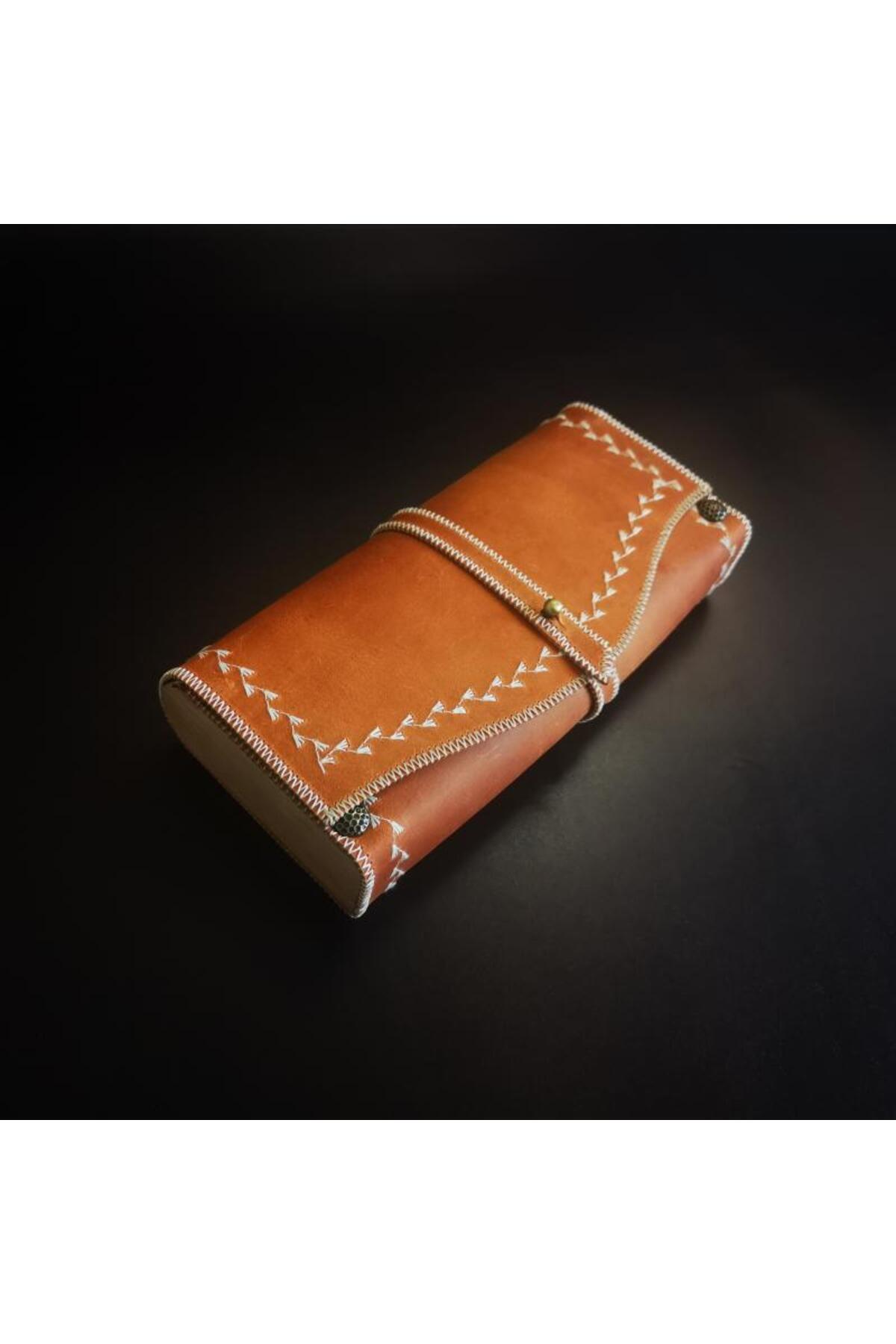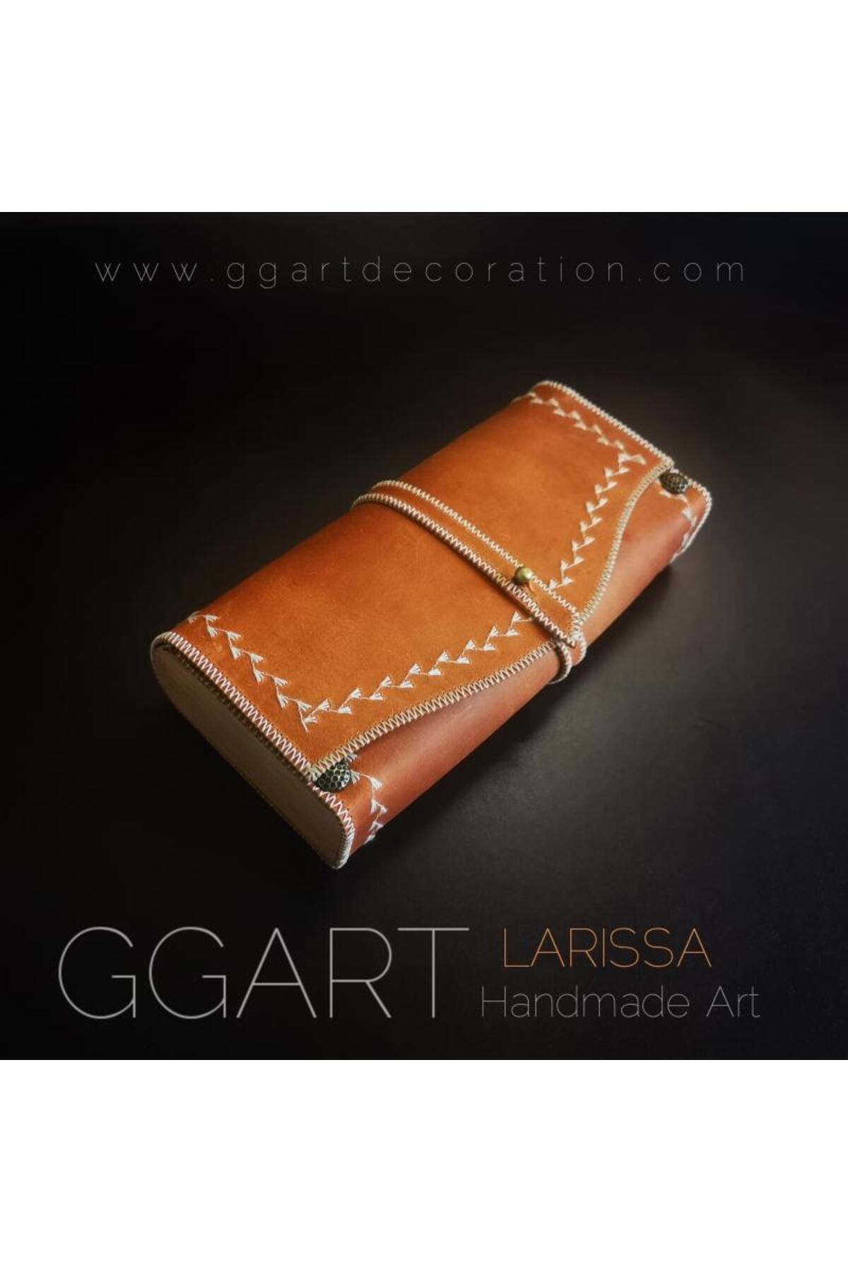 GENUINE LEATHER HAND MADE BAG - LARISSA FEATURES - Our products are produced using top quality Genuine Leather (Crazy, Vegetal) and with 100% Hand Labor in a warm house converted into a workshop. - The edges of the designs are sewn by hand with a 1950 model PFAF brand sewing machine and overcasting is done to prevent edge fraying. - Each of our bags has embroidery on leather using a high-end embroidery machine from PFAF brand. All of our embroideries are embroidered with ANCHOR brand embroidery threads. - The inside of our bags, the reverse side of the leather, is covered and closed with Scottish Linen in accordance with the design. - Wooden Edges are manufactured from BB – BC Quality Solid Panel or Ireko Wood Solid Panel. - Brass Behçi is used on the product cover. It is nailed from the front and back with patterned ribs and glued to the wooden material beforehand. - The products are packaged in a cardboard box specific to their size, wrapped in white tissue paper and closed with a wicker rope, and the box is filled with scraps. The cargo is delivered to you with a presentation in the style of a gift package. - DIMENSIONS 23cmX10cmX5.5cm The product has the volume and width to accommodate a mobile phone, wallet, business card holder and various make-up accessories.