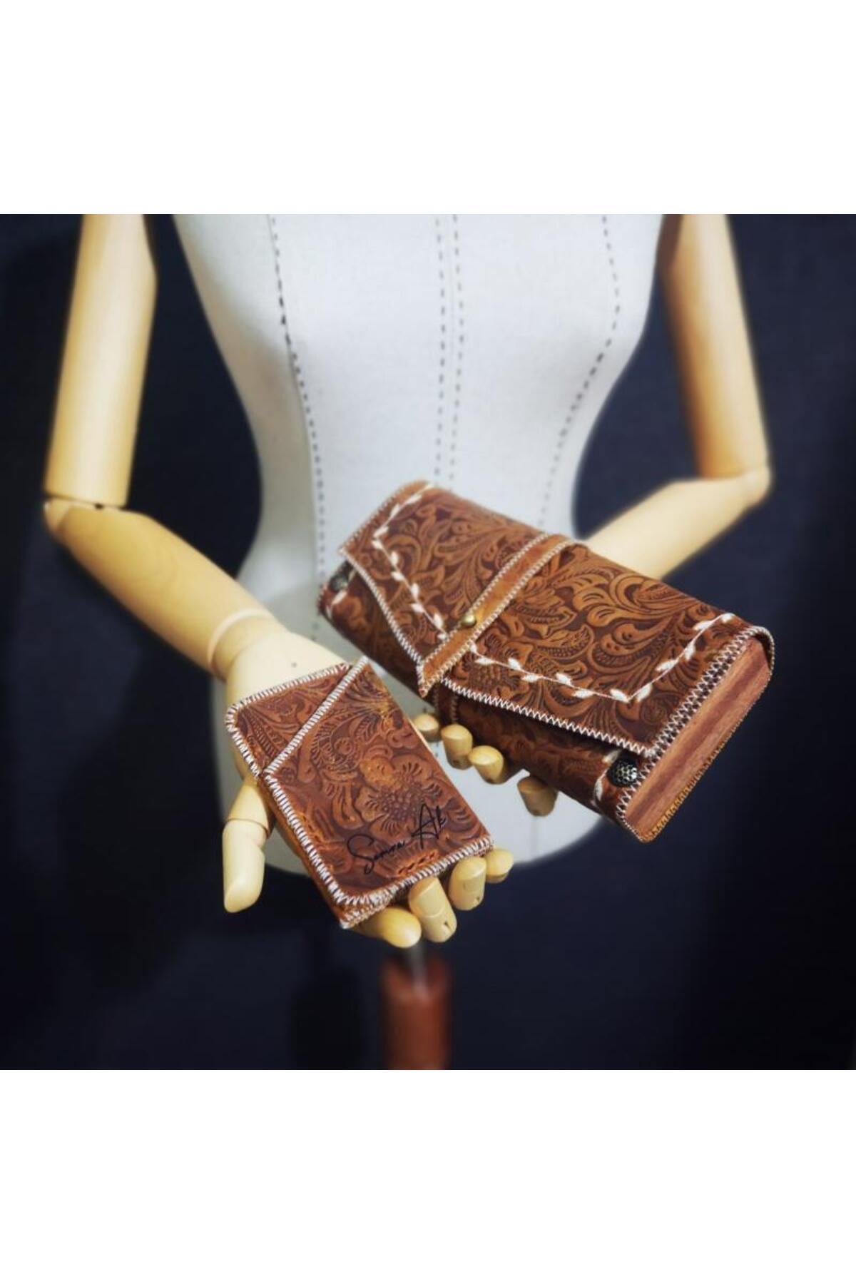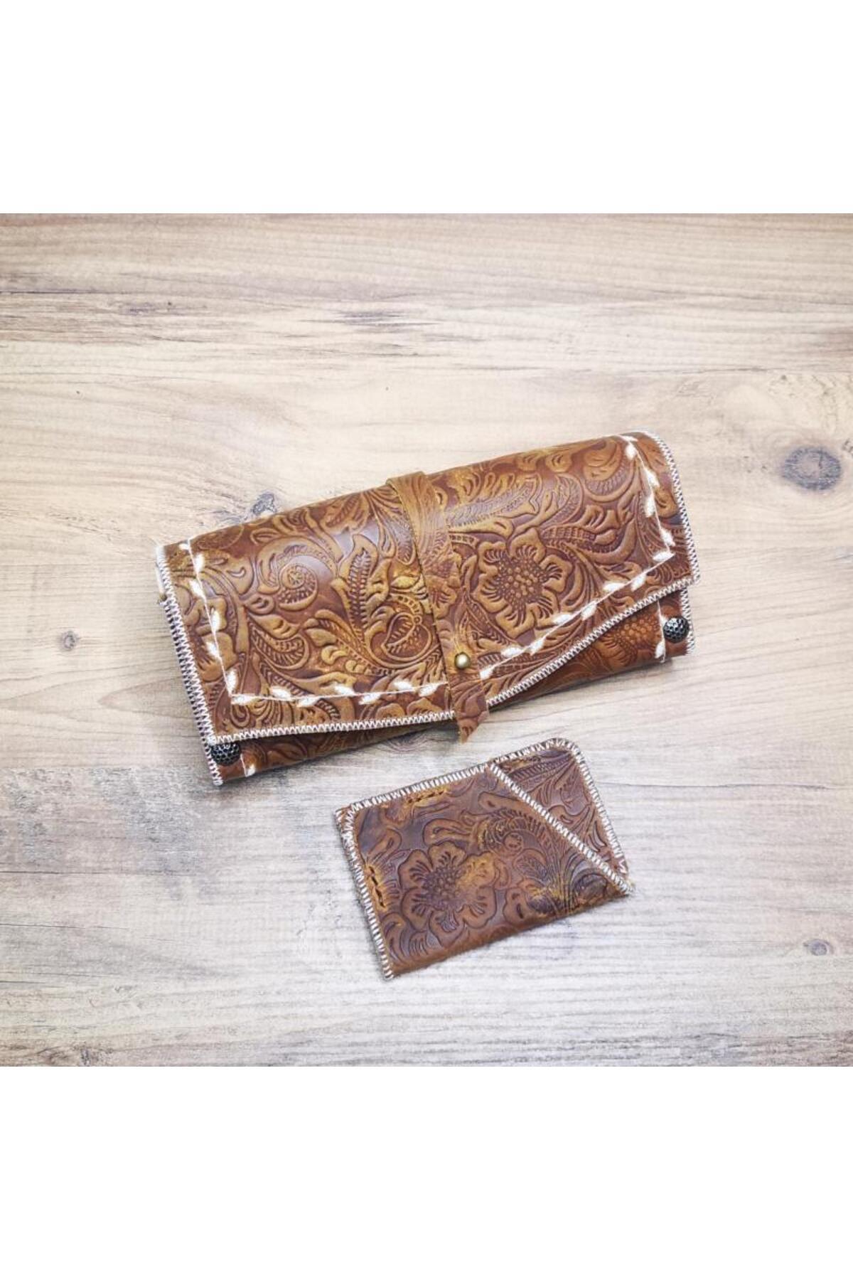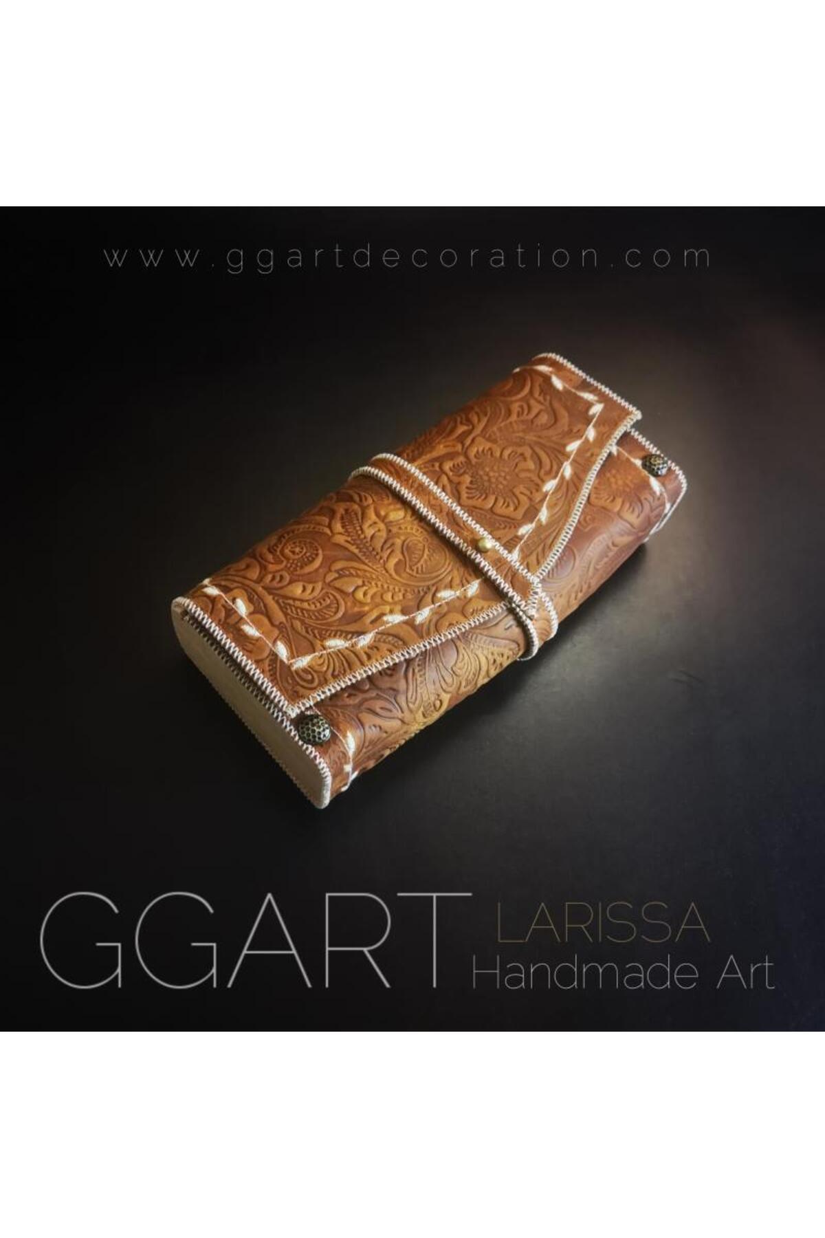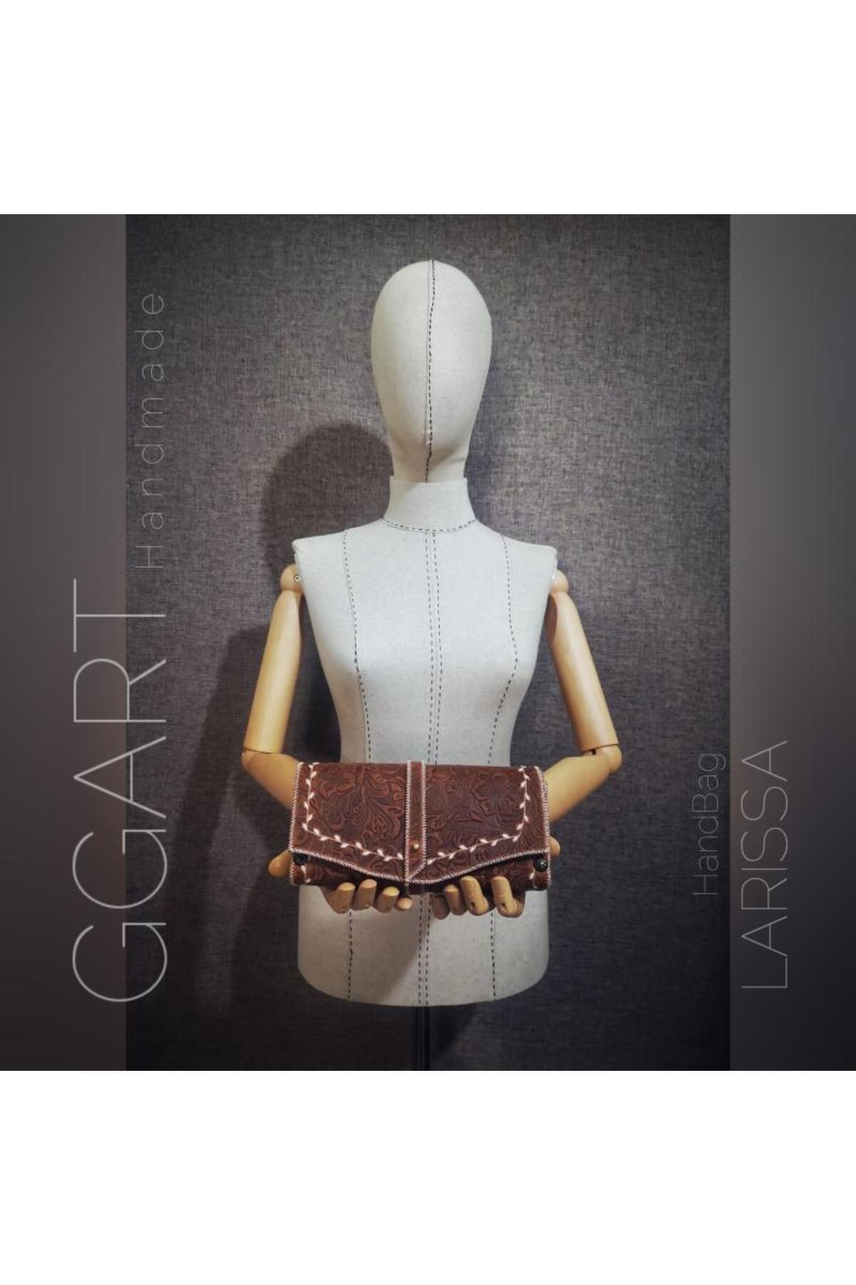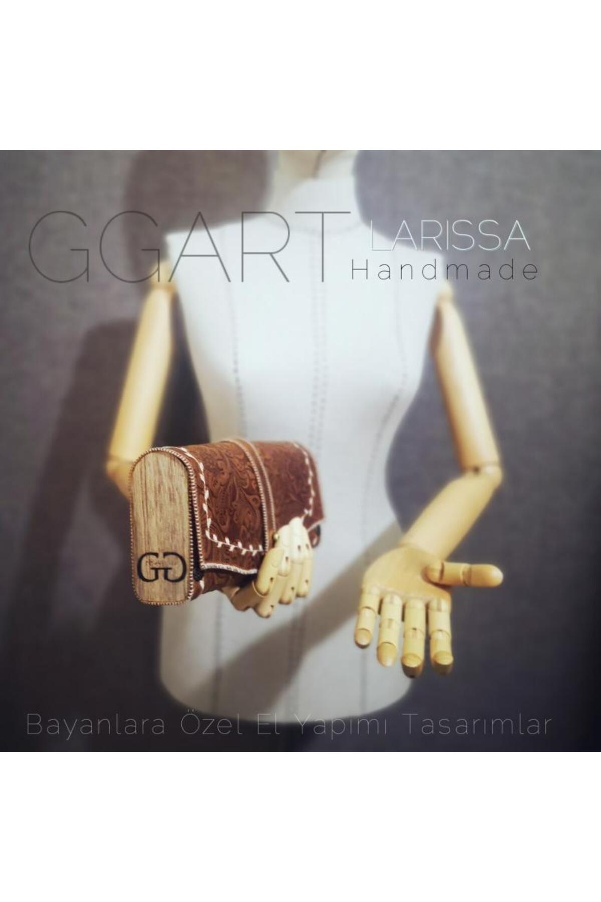 GENUINE LEATHER HAND MADE BAG - LARISSA FEATURES - Our products are produced using top quality Genuine Leather (Crazy, Vegetal) and with 100% Hand Labor in a warm house converted into a workshop. - The edges of the designs are sewn by hand with a 1950 model PFAF brand sewing machine and overcasting is done to prevent edge fraying. - Each of our bags has embroidery on leather using a high-end embroidery machine from PFAF brand. All of our embroideries are embroidered with ANCHOR brand embroidery threads. - The inside of our bags, the reverse side of the leather, is covered and closed with Scottish Linen in accordance with the design. - Wooden Edges are manufactured from BB – BC Quality Solid Panel or Ireko Wood Solid Panel. - Brass Behçi is used on the product cover. It is nailed from the front and back with patterned ribs and glued to the wooden material beforehand. - The products are packaged in a cardboard box specific to their size, wrapped in white tissue paper and closed with a wicker rope, and the box is filled with scraps. The cargo is delivered to you with a presentation in the style of a gift package. - DIMENSIONS 23cmX10cmX5.5cm The product has the volume and width to accommodate a mobile phone, wallet, business card holder and various make-up accessories.