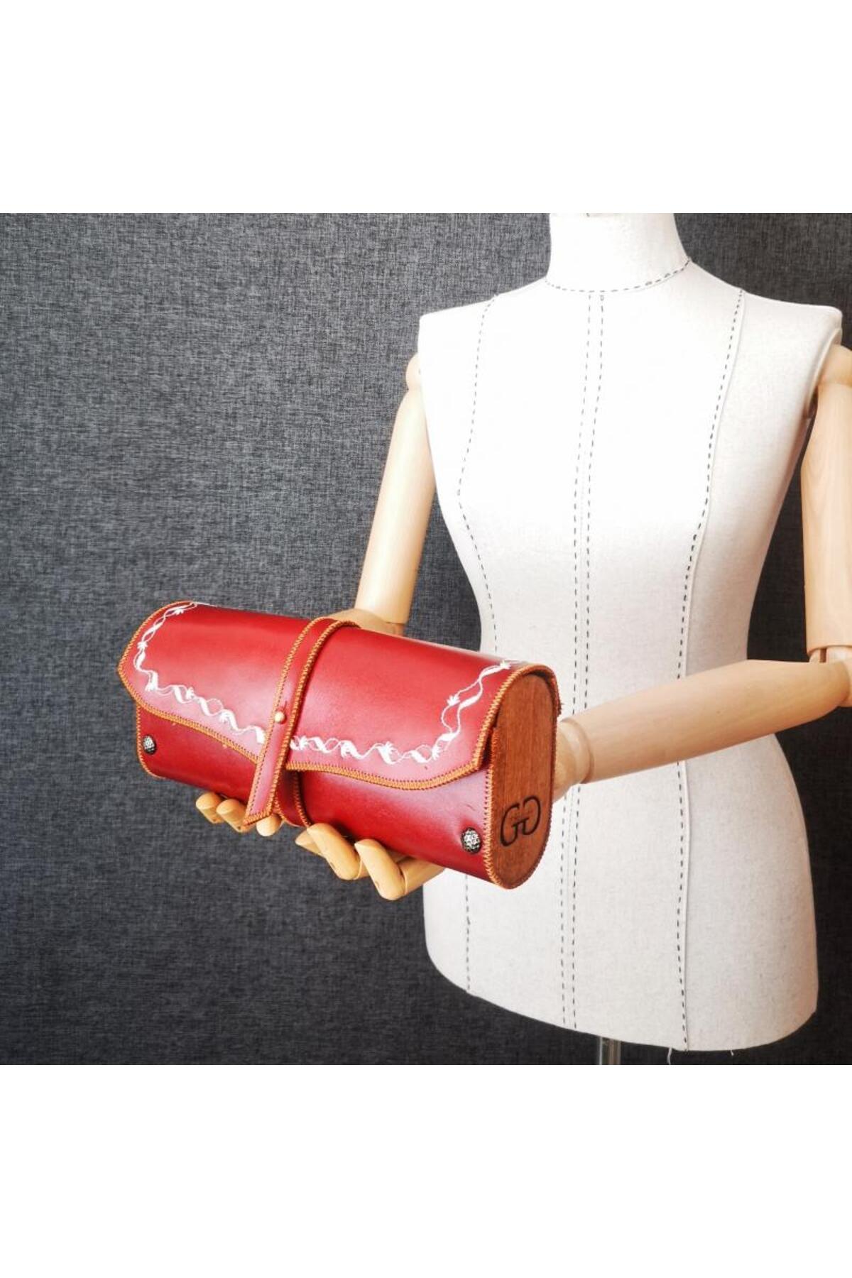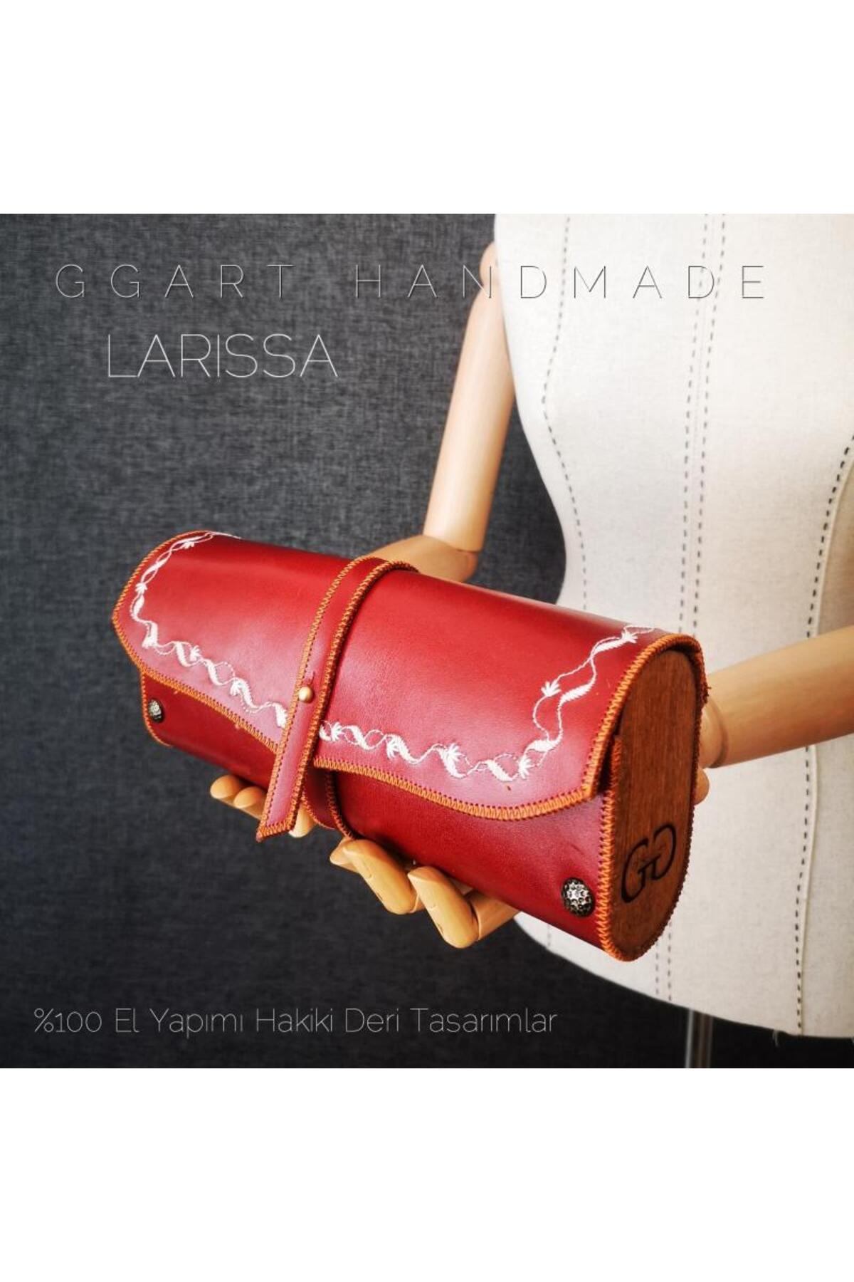 GENUINE LEATHER HAND MADE BAG - LARISSA FEATURES - Our products are produced using top quality Genuine Leather (Crazy, Vegetal) and with 100% Hand Labor in a warm house converted into a workshop. - The edges of the designs are sewn by hand with a 1950 model PFAF brand sewing machine and overcasting is done to prevent edge fraying. - Each of our bags has embroidery on leather using a high-end embroidery machine from PFAF brand. All of our embroideries are embroidered with ANCHOR brand embroidery threads. - The inside of our bags, the reverse side of the leather, is covered and closed with Scottish Linen in accordance with the design. - Wooden Edges are manufactured from BB – BC Quality Solid Panel or Ireko Wood Solid Panel. - Brass Behçi is used on the product cover. It is nailed from the front and back with patterned ribs and glued to the wooden material beforehand. - The products are packaged in a cardboard box specific to their size, wrapped in white tissue paper and closed with a wicker rope, and the box is filled with scraps. The cargo is delivered to you with a presentation in the style of a gift package. - DIMENSIONS 23cmX10cmX5.5cm The product has the volume and width to accommodate a mobile phone, wallet, business card holder and various make-up accessories.
