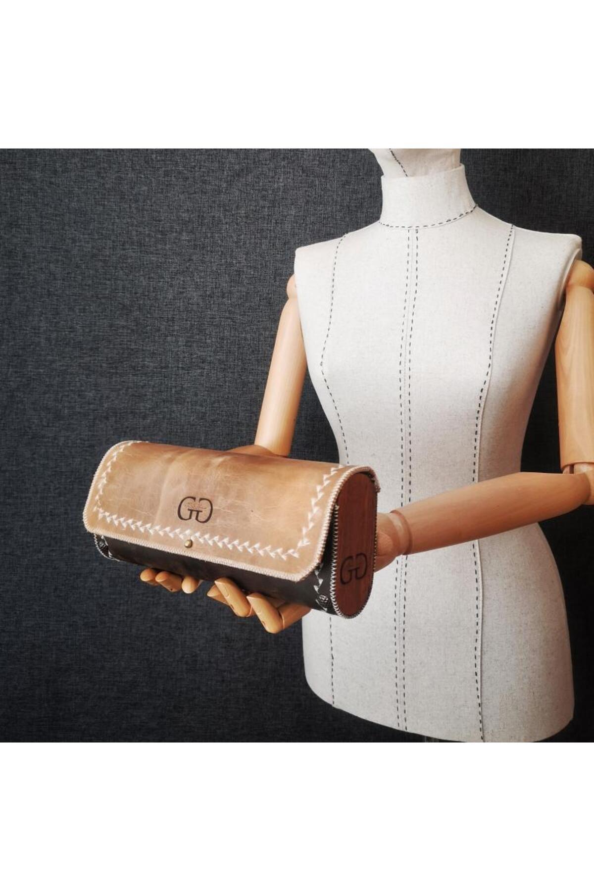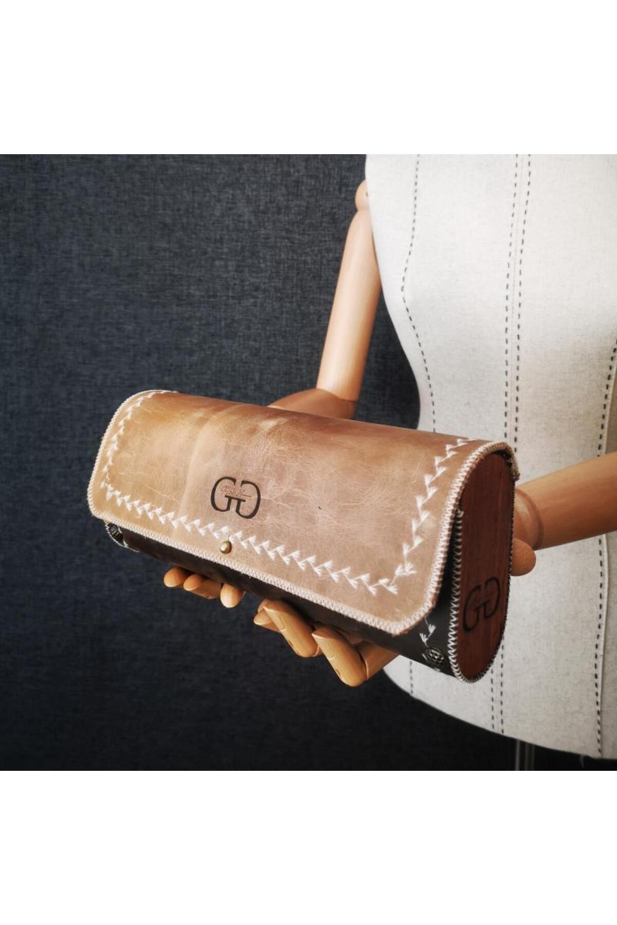 GENUINE LEATHER HAND MADE BAG - LARISSA FEATURES - Our products are produced using top quality Genuine Leather (Crazy, Vegetal) and with 100% Hand Labor in a warm house converted into a workshop. - The edges of the designs are sewn by hand with a 1950 model PFAF brand sewing machine and overcasting is done to prevent edge fraying. - Each of our bags has embroidery on leather using a high-end embroidery machine from PFAF brand. All of our embroideries are embroidered with ANCHOR brand embroidery threads. - The inside of our bags, the reverse side of the leather, is covered and closed with Scottish Linen in accordance with the design. - Wooden Edges are manufactured from BB – BC Quality Solid Panel or Ireko Wood Solid Panel. - Brass Behçi is used on the product cover. It is nailed from the front and back with patterned ribs and glued to the wooden material beforehand. - The products are packaged in a cardboard box specific to their size, wrapped in white tissue paper and closed with a wicker rope, and the box is filled with scraps. The cargo is delivered to you with a presentation in the style of a gift package. - DIMENSIONS 23cmX10cmX5.5cm The product has the volume and width to accommodate a mobile phone, wallet, business card holder and various make-up accessories.