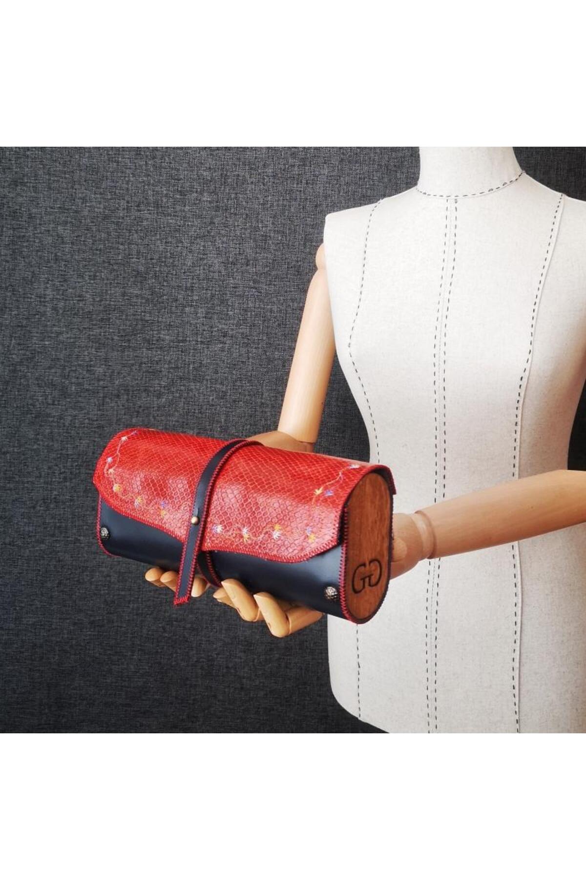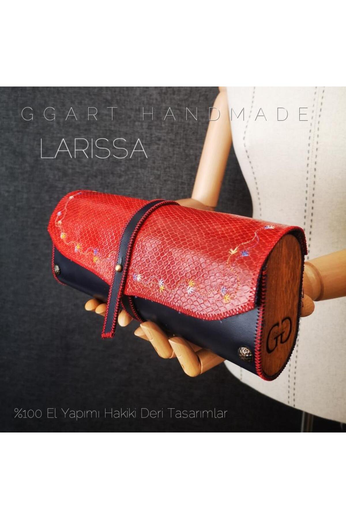 GENUINE LEATHER HAND MADE BAG - LARISSA FEATURES - Our products are produced using top quality Genuine Leather (Crazy, Vegetal) and with 100% Hand Labor in a warm house converted into a workshop. - The edges of the designs are sewn by hand with a 1950 model PFAF brand sewing machine and overcasting is done to prevent edge fraying. - Each of our bags has embroidery on leather using a high-end embroidery machine from PFAF brand. All of our embroideries are embroidered with ANCHOR brand embroidery threads. - The inside of our bags, the reverse side of the leather, is covered and closed with Scottish Linen in accordance with the design. - Wooden Edges are manufactured from BB – BC Quality Solid Panel or Ireko Wood Solid Panel. - Brass Behçi is used on the product cover. It is nailed from the front and back with patterned ribs and glued to the wooden material beforehand. - The products are packaged in a cardboard box specific to their size, wrapped in white tissue paper and closed with a wicker rope, and the box is filled with scraps. The cargo is delivered to you with a presentation in the style of a gift package. - DIMENSIONS 23cmX10cmX5.5cm The product has the volume and width to accommodate a mobile phone, wallet, business card holder and various make-up accessories.