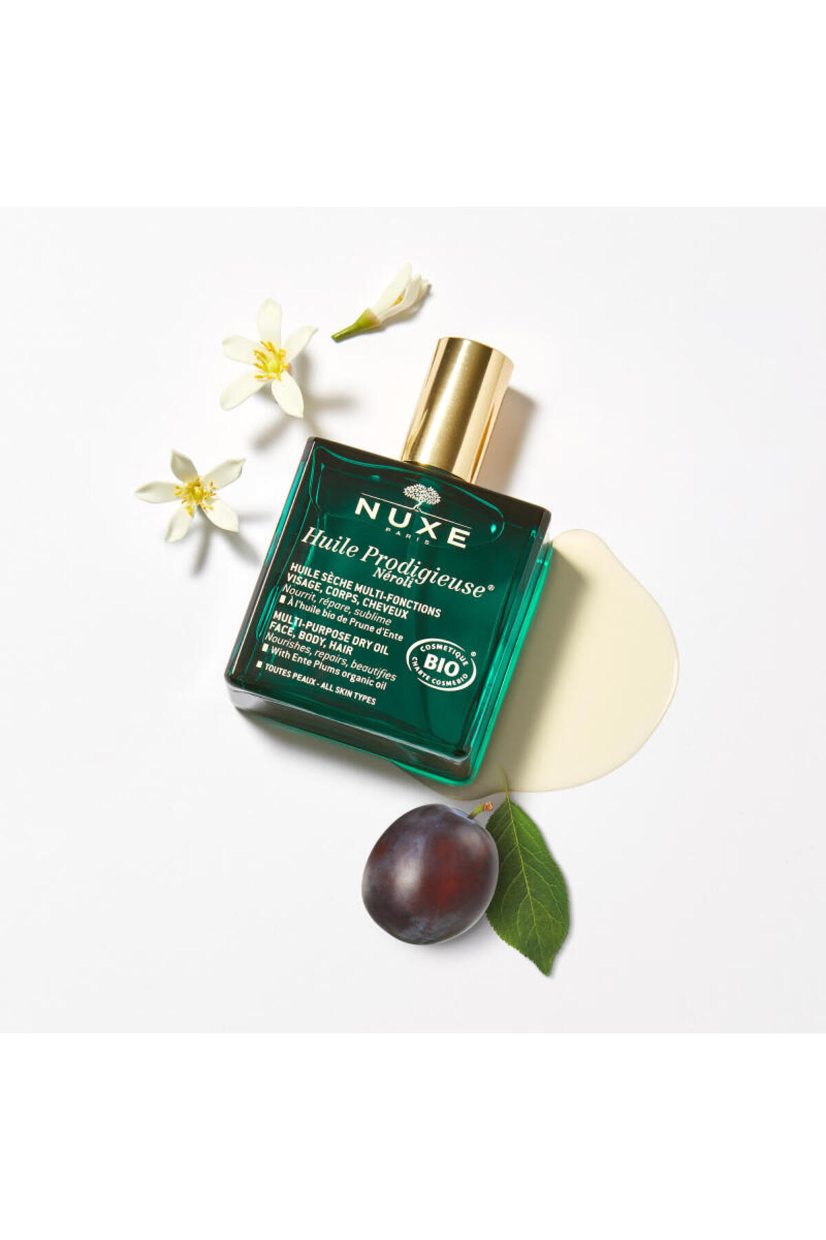 This multi-purpose dry oil helps nourish and moisturize the skin. It nourishes and moisturizes, providing care for all hair types. It has 100% natural ingredients. It creates a protective layer on the skin. It has a unique texture and a fascinating scent. It can be used on face, body and hair. It provides serenity and happiness with the soothing scent of orange flower. It helps reduce the appearance of cracks.