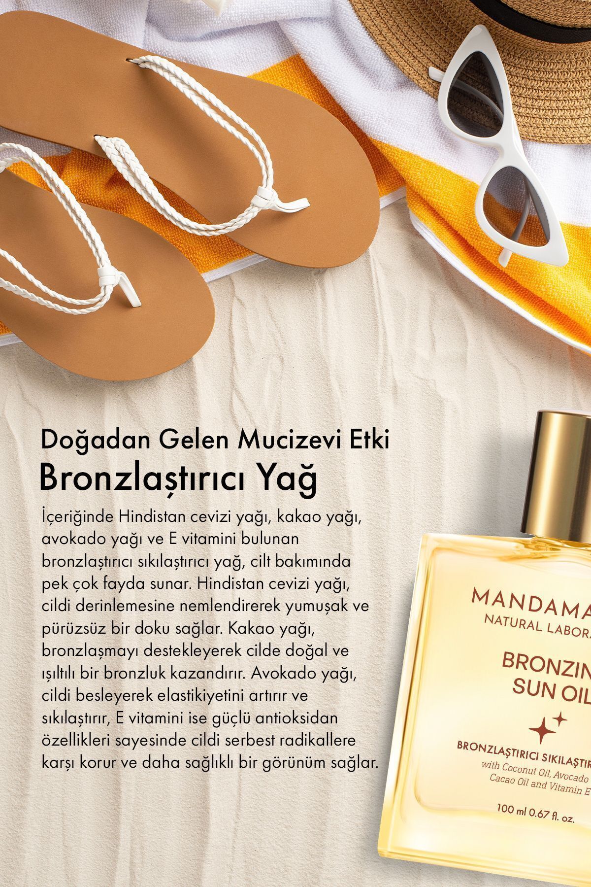 Mandamarina Bronzing and Firming Pure Oils Series Contains 18 Pure Oils. Thanks to the USA California Formula we blended, it has both an instant permanent tan and a body firming effect. Summer months are the tanning months that women especially wait for. You can use our special tanning oil to tan easily, tighten your body in summer, and use this tan for a long time. This product, which has undergone a Dermatological Test (Patch Test), has been specially produced in limited numbers. It provides quick and permanent tanning naturally while sunbathing with exotic tropical coconut oil, cocoa butter, carrot oil and avocado oil. It contains Orange Oil, Sesame and Avocado Oil, and vitamin E. It nourishes, moisturizes and gives shine to the skin. It also begins to tighten and tone the body... USAGE: Apply to the skin half an hour before going out in the sun. It is recommended to repeat it every 2-3 hours, especially after contact with water. If it is to be used only as a firming agent, massage upward every evening and thoroughly absorb the oil into the skin... WARNINGS: Used externally. In case of contact with eyes, rinse with plenty of water. Store in a cool, dry place. Keep out of reach of children. It is not suitable for use by children under 3 years of age.