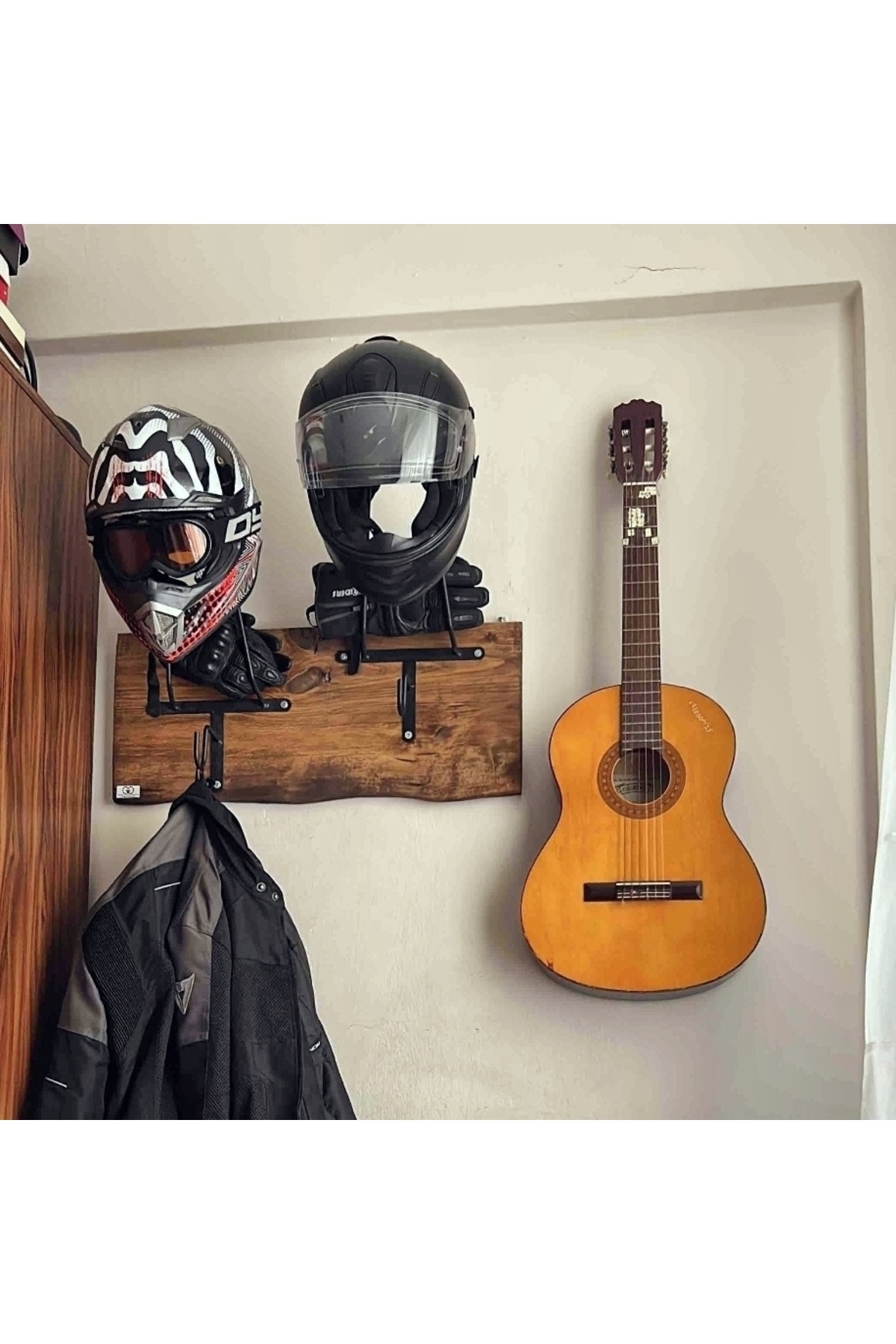 SPECIAL HELMET HANGER, COAT RACK, EQUIPMENT RACK FOR MOTORCYCLERS Product Features SPECIAL DESIGN THAT DOES NOT CONTACT THE PAD - Metal part angles and lengths are specially designed and do not come into contact with the protective pad inside the helmet. When you place your helmet correctly, it rests on the visor upper gap and the upper part of the neck, allowing your helmet to lie flat as if it were on your head, without touching the pad. - The metal design of the helmet hangers is independent of the size of your helmet and is suitable for all sizes. - It is manufactured using 6mm Transmission iron. It does not bend or bend and is extremely durable. - Baked Electrostatic Black Matte Texture Painted. In this way, the metal parts do not scratch or rust and maintain their form for years. - Panels used in wooden models are made of BB - BC quality natural wood solid panels (models with smooth edges are X2-MP, Pine or Spruce) or specially cut from imported Russian pine and made of solid, one-piece natural wood panels (models with natural looking edges are X2-Natura). is manufactured. - Printed and illustrated models are Glossy 1st Class Canvas prints. The canvas print is placed on a wooden panel and stapled at the back. HELMET RACK, COAT RANGER and KEYRING RANGER - 2 cobra hooks are delivered with the product to hang your keys. You can mount these hooks at any point you want on the panel. - There is a hook on each metal part of the helmet hanger bars to hang your coat on the clothes hanger. Metal parts are delivered disassembled to prevent damage to the panel during shipping. You can mount it practically with 3 screws. Screws and washers are packaged within the product. EASY INSTALLATION Easy installation with two hangers on the back. All you have to do is place a dowel and two screws on the wall. You hang the product like a painting. Since the wall type is unknown, the screws and dowels to mount it on the wall are not included in the package. Product Dimensions SINGLE HANGERS - 30X50cm back panel size. DOUBLE HANGERS - 30x70cm back wood panel size. ECO MODEL - 10x50cm back wood panel size. PERSONALIZATION - If personalization is desired on the panel, NAME-SURNAME, LOGO or NICKNAME can be engraved with CNC Laser, free of charge, in the lower left corner. - If orders come from sales channels, Genuine Leather is personalized and added to the package. You can easily stick it to any corner of the panel you want. - Do not forget to send your photos in the appropriate resolution and format for our hangers prepared as canvas prints. IN CASE OF SHIPPING AND DAMAGE - Although it is a very, very rare situation that we encounter the product being damaged in shipping, we kindly ask you to please contact us. We always deliver a new one to replace the damaged part. - It is very important for you to spare time for your damaged cargo and keep a cargo damage report so that our efforts do not go to waste. Even if there is no report, we will definitely resolve your grievance. GGART DECORATION - GGART HANDMADE