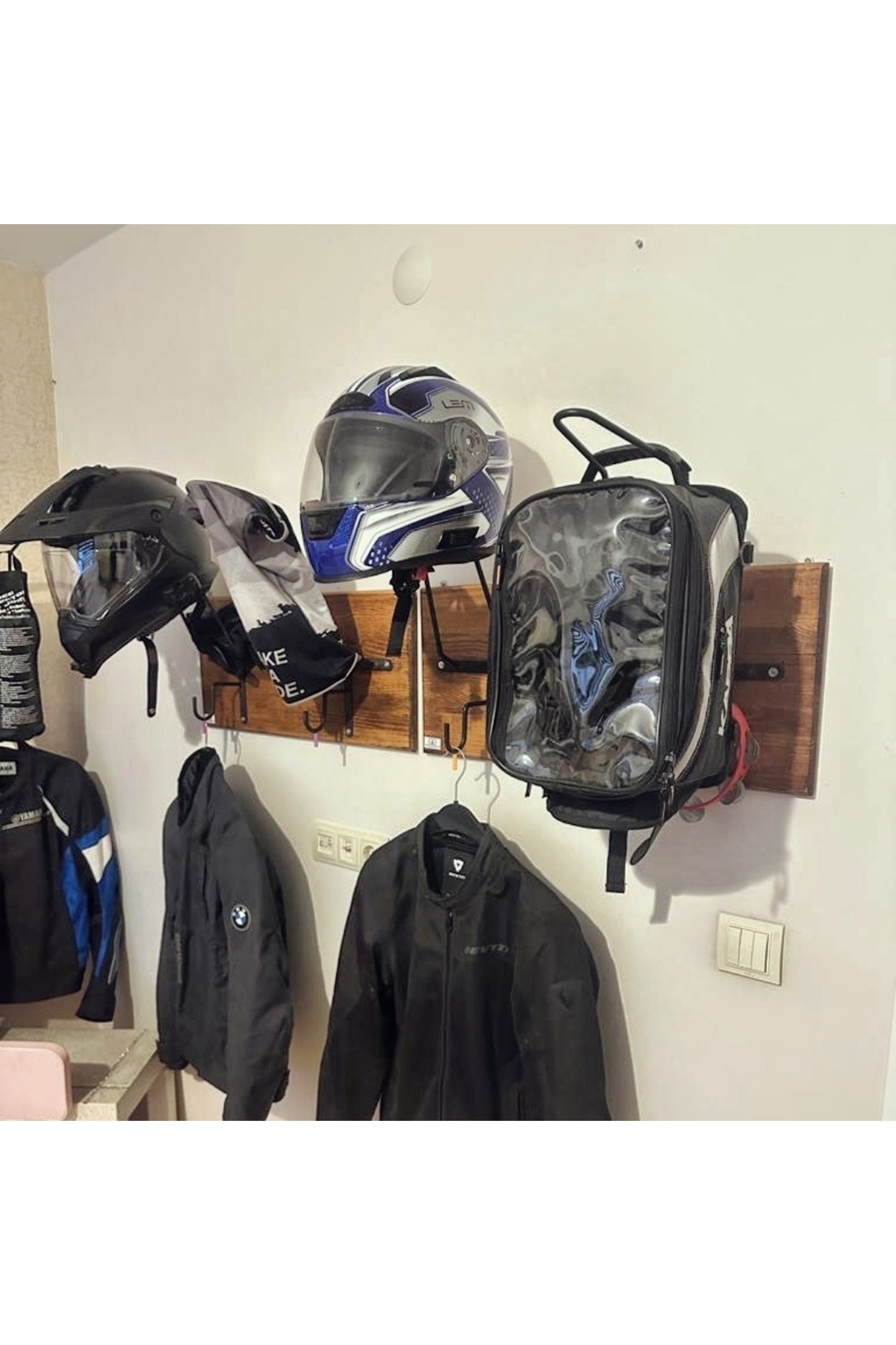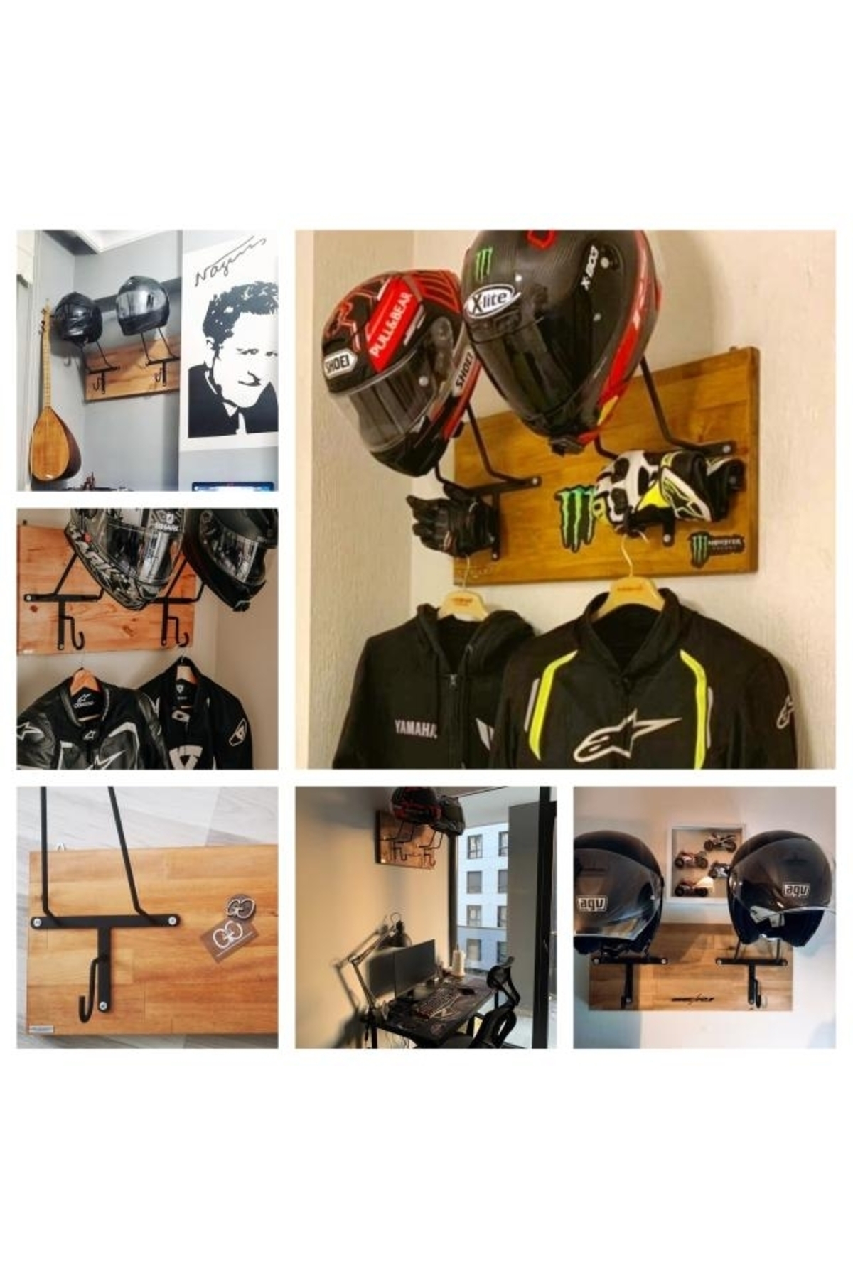 SPECIAL HELMET HANGER, COAT RACK, EQUIPMENT RACK FOR MOTORCYCLERS Product Features SPECIAL DESIGN THAT DOES NOT CONTACT THE PAD - Metal part angles and lengths are specially designed and do not come into contact with the protective pad inside the helmet. When you place your helmet correctly, it rests on the visor upper gap and the upper part of the neck, allowing your helmet to lie flat as if it were on your head, without touching the pad. - The metal design of the helmet hangers is independent of the size of your helmet and is suitable for all sizes. - It is manufactured using 6mm Transmission iron. It does not bend or bend and is extremely durable. - Baked Electrostatic Black Matte Texture Painted. In this way, the metal parts do not scratch or rust and maintain their form for years. - Panels used in wooden models are made of BB - BC quality natural wood solid panels (models with smooth edges are X2-MP, Pine or Spruce) or specially cut from imported Russian pine and made of solid, one-piece natural wood panels (models with natural looking edges are X2-Natura). is manufactured. - Printed and illustrated models are Glossy 1st Class Canvas prints. The canvas print is placed on a wooden panel and stapled at the back. HELMET RACK, COAT RANGER and KEYRING RANGER - 2 cobra hooks are delivered with the product to hang your keys. You can mount these hooks at any point you want on the panel. - There is a hook on each metal part of the helmet hanger bars to hang your coat on the clothes hanger. Metal parts are delivered disassembled to prevent damage to the panel during shipping. You can mount it practically with 3 screws. Screws and washers are packaged within the product. EASY INSTALLATION Easy installation with two hangers on the back. All you have to do is place a dowel and two screws on the wall. You hang the product like a painting. Since the wall type is unknown, the screws and dowels to mount it on the wall are not included in the package. Product Dimensions SINGLE HANGERS - 30X50cm back panel size. DOUBLE HANGERS - 30x70cm back wood panel size. ECO MODEL - 10x50cm back wood panel size. PERSONALIZATION - If personalization is desired on the panel, NAME-SURNAME, LOGO or NICKNAME can be engraved with CNC Laser, free of charge, in the lower left corner. - If orders come from sales channels, Genuine Leather is personalized and added to the package. You can easily stick it to any corner of the panel you want. - Do not forget to send your photos in the appropriate resolution and format for our hangers prepared as canvas prints. IN CASE OF SHIPPING AND DAMAGE - Although it is a very, very rare situation that we encounter the product being damaged in shipping, we kindly ask you to please contact us. We always deliver a new one to replace the damaged part. - It is very important for you to spare time for your damaged cargo and keep a cargo damage report so that our efforts do not go to waste. Even if there is no report, we will definitely resolve your grievance. GGART DECORATION - GGART HANDMADE
