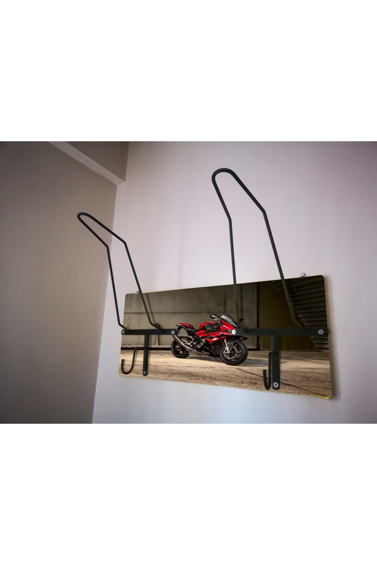 SPECIAL HELMET HANGER, COAT RACK, EQUIPMENT RACK FOR MOTORCYCLERS Product Features SPECIAL DESIGN THAT DOES NOT CONTACT THE PAD - Metal part angles and lengths are specially designed and do not come into contact with the protective pad inside the helmet. When you place your helmet correctly, it rests on the visor upper gap and the upper part of the neck, allowing your helmet to lie flat as if it were on your head, without touching the pad. - The metal design of the helmet hangers is independent of the size of your helmet and is suitable for all sizes. - It is manufactured using 6mm Transmission iron. It does not bend or bend and is extremely durable. - Baked Electrostatic Black Matte Texture Painted. In this way, the metal parts do not scratch or rust and maintain their form for years. - Panels used in wooden models are made of BB - BC quality natural wood solid panels (models with smooth edges are X2-MP, Pine or Spruce) or specially cut from imported Russian pine and made of solid, one-piece natural wood panels (models with natural looking edges are X2-Natura). is manufactured. - Printed and illustrated models are Glossy 1st Class Canvas prints. The canvas print is placed on a wooden panel and stapled at the back. HELMET RACK, COAT RANGER and KEYRING RANGER - 2 cobra hooks are delivered with the product to hang your keys. You can mount these hooks at any point you want on the panel. - There is a hook on each metal part of the helmet hanger bars to hang your coat on the clothes hanger. Metal parts are delivered disassembled to prevent damage to the panel during shipping. You can mount it practically with 3 screws. Screws and washers are packaged within the product. EASY INSTALLATION Easy installation with two hangers on the back. All you have to do is place a dowel and two screws on the wall. You hang the product like a painting. Since the wall type is unknown, the screws and dowels to mount it on the wall are not included in the package. Product Dimensions SINGLE HANGERS - 30X50cm back panel size. DOUBLE HANGERS - 30x70cm back wood panel size. ECO MODEL - 10x50cm back wood panel size. PERSONALIZATION - If personalization is desired on the panel, NAME-SURNAME, LOGO or NICKNAME can be engraved with CNC Laser, free of charge, in the lower left corner. - If orders come from sales channels, Genuine Leather is personalized and added to the package. You can easily stick it to any corner of the panel you want. - Do not forget to send your photos in the appropriate resolution and format for our hangers prepared as canvas prints. IN CASE OF SHIPPING AND DAMAGE - Although it is a very, very rare situation that we encounter the product being damaged in shipping, we kindly ask you to please contact us. We always deliver a new one to replace the damaged part. - It is very important for you to spare time for your damaged cargo and keep a cargo damage report so that our efforts do not go to waste. Even if there is no report, we will definitely resolve your grievance. GGART DECORATION - GGART HANDMADE