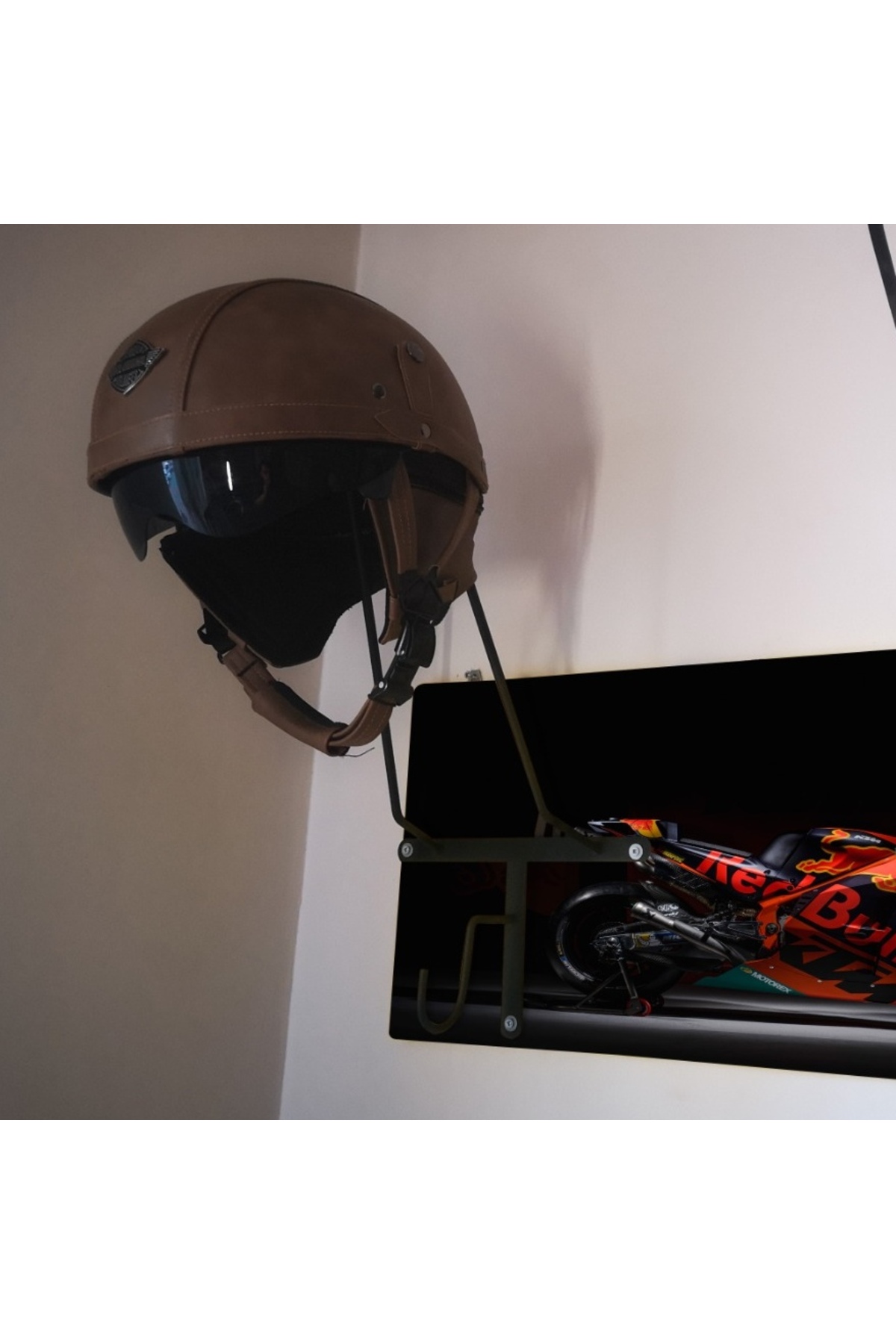 SPECIAL HELMET HANGER, COAT RACK, EQUIPMENT RACK FOR MOTORCYCLERS Product Features SPECIAL DESIGN THAT DOES NOT CONTACT THE PAD - Metal part angles and lengths are specially designed and do not come into contact with the protective pad inside the helmet. When you place your helmet correctly, it rests on the visor upper gap and the upper part of the neck, allowing your helmet to lie flat as if it were on your head, without touching the pad. - The metal design of the helmet hangers is independent of the size of your helmet and is suitable for all sizes. - It is manufactured using 6mm Transmission iron. It does not bend or bend and is extremely durable. - Baked Electrostatic Black Matte Texture Painted. In this way, the metal parts do not scratch or rust and maintain their form for years. - Panels used in wooden models are made of BB - BC quality natural wood solid panels (models with smooth edges are X2-MP, Pine or Spruce) or specially cut from imported Russian pine and made of solid, one-piece natural wood panels (models with natural looking edges are X2-Natura). is manufactured. - Printed and illustrated models are Glossy 1st Class Canvas prints. The canvas print is placed on a wooden panel and stapled at the back. HELMET RACK, COAT RANGER and KEYRING RANGER - 2 cobra hooks are delivered with the product to hang your keys. You can mount these hooks at any point you want on the panel. - There is a hook on each metal part of the helmet hanger bars to hang your coat on the clothes hanger. Metal parts are delivered disassembled to prevent damage to the panel during shipping. You can mount it practically with 3 screws. Screws and washers are packaged within the product. EASY INSTALLATION Easy installation with two hangers on the back. All you have to do is place a dowel and two screws on the wall. You hang the product like a painting. Since the wall type is unknown, the screws and dowels to mount it on the wall are not included in the package. Product Dimensions SINGLE HANGERS - 30X50cm back panel size. DOUBLE HANGERS - 30x70cm back wood panel size. ECO MODEL - 10x50cm back wood panel size. PERSONALIZATION - If personalization is desired on the panel, NAME-SURNAME, LOGO or NICKNAME can be engraved with CNC Laser, free of charge, in the lower left corner. - If orders come from sales channels, Genuine Leather is personalized and added to the package. You can easily stick it to any corner of the panel you want. - Do not forget to send your photos in the appropriate resolution and format for our hangers prepared as canvas prints. IN CASE OF SHIPPING AND DAMAGE - Although it is a very, very rare situation that we encounter the product being damaged in shipping, we kindly ask you to please contact us. We always deliver a new one to replace the damaged part. - It is very important for you to spare time for your damaged cargo and keep a cargo damage report so that our efforts do not go to waste. Even if there is no report, we will definitely resolve your grievance. GGART DECORATION - GGART HANDMADE