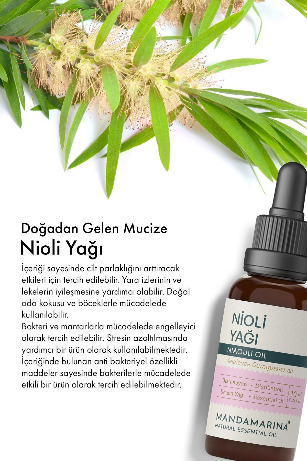 Mandamarina Pure Nioli Oil 10 ml Mandamarina Nioli Oil is a volatile oil obtained by distillation from the Nioli (Maleleuca Viridiflora) tree, also known as "broad-leaved paper bark" among the public. Nioli tree oil is a natural pure oil mostly used for fungal odor and discharge in men and women. Mandamarina Nioli Oil; Naturally formulated for hair, skin and nails. It helps reduce skin imperfections while supporting skin nutrition. Women and Men can easily use it in private areas by adding 2-3 drops to your underwear. It also contributes to strengthening the scalp and hair follicles and also supports the prevention of blackheads. It also nourishes and helps repair nails.