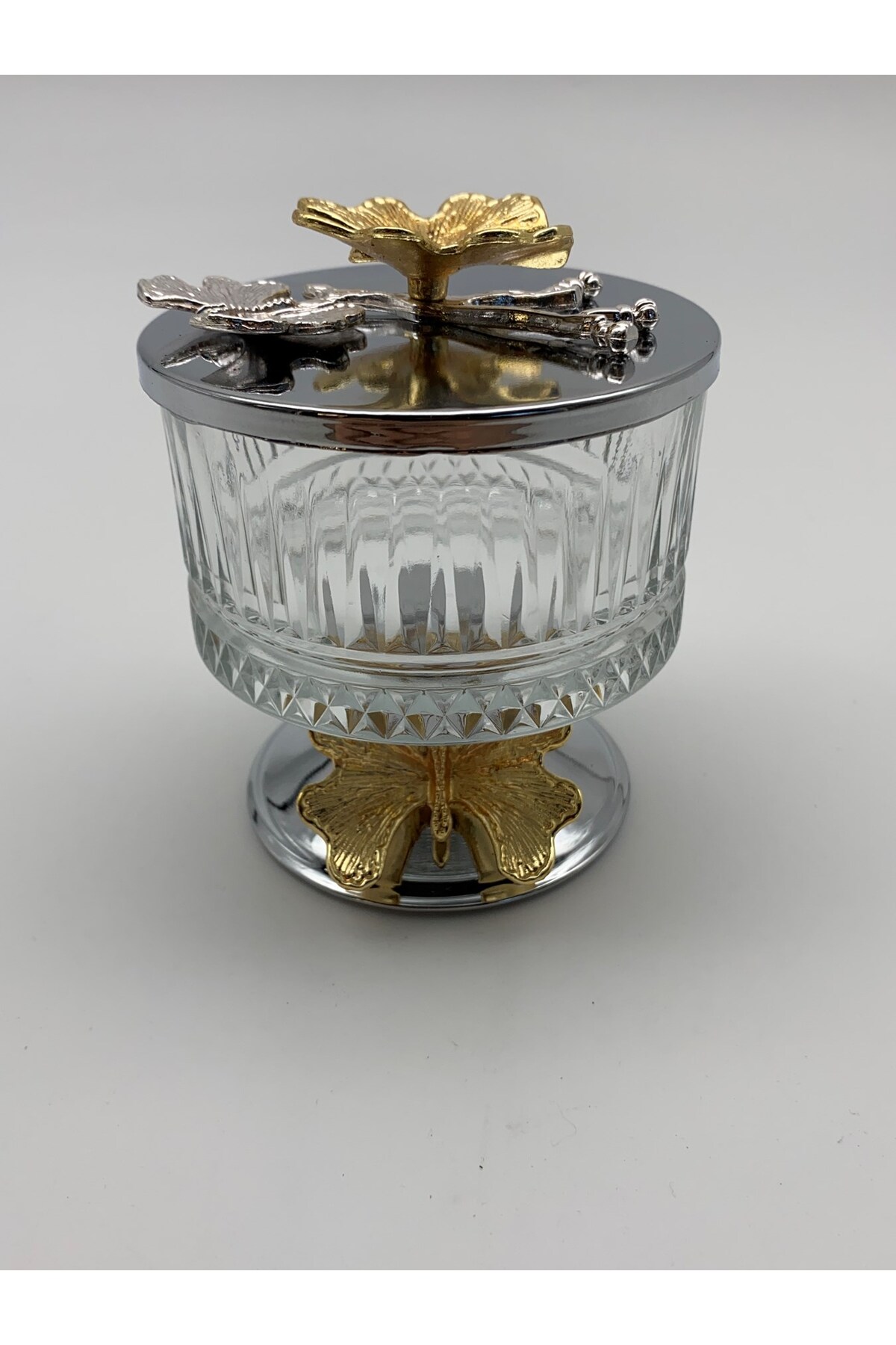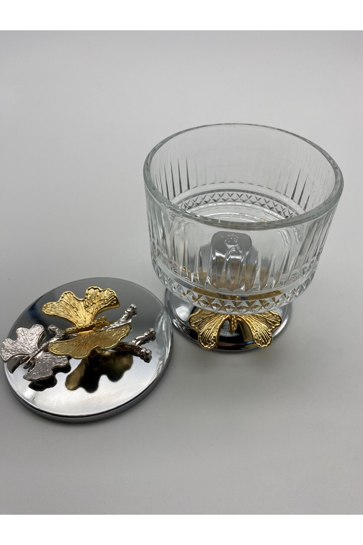 Silver Elysia Glass Magnolia Bowl with Foot, Butterfly Lid Ice Cream Dish, Sugar Bowl, Snack Bowl