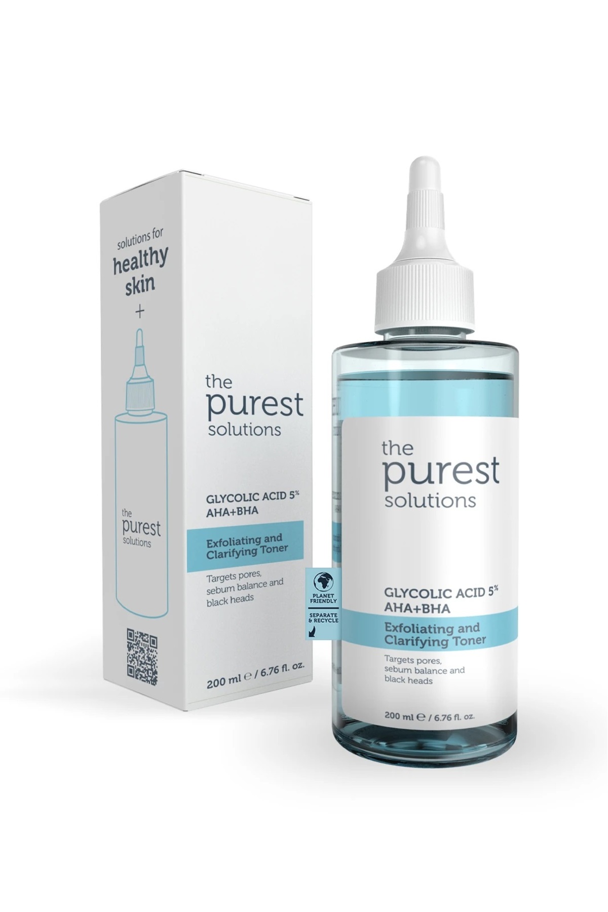 The purest solutions pore tightening and purifying tonic 200 ml glycolic acid 5% aha + bha give feedback the purest solutions pore tightening and purifying tonic 200 ml (glycolic acid 5% aha + bha) the purest solutions exfoliating and clarifying toner glycolic acid 5% What is aha+bha (200ml)? It helps gently cleanse the skin of dead skin, oil, dirt and makeup residue, reduce the appearance of pores and balance sebum secretion. It is effective in renewing the skin and protecting it against signs of aging. · Skin with pore problems · Skin that needs oil balancing · All skin types How to use? After cleansing the skin, apply it to the entire skin at night with the help of cotton. Warnings: For external use only. Before use, apply the product to a small part of your skin to prevent possible undesirable side effects and irritation. If sensitivity does not occur, continue using the product. If sensitivity occurs after application, stop using the product and consult your doctor. Avoid contact with eyes. In case of contact, wash with plenty of water. Keep in a safe place out of reach of children and away from direct sun contact. It is not recommended to apply on sensitive and irritated skin. Due to its AHA (alpha hydroxy acid) content, it may sensitize your skin to the sun and cause sunburns. Do not forget to use sunscreen from the moment you start using the product. Content: Aqua, glycolic acid, phenethyl alcohol, propylene glycol, panthenol, ppg-1-Peg-9 lauryl glycol ether, coceth-7, inulin, 1,2-Hexanediol, parfum, triethanolamine, peg-40 hydrogenated castor oil, fructose , tetrasodium edta, copper gluconate, citric acid, sodium hyaluronate, lactic acid, ascorbic acid, malic acid, gluconic acid, phenoxyethanol, salicylic acid, tartaric acid, ethylhexylglycerin It is a combination of malic acid, gluconic acid, glycolic acid and tartaric acid), salicylic acid and ascorbic acid. It has a positive function in removing dead cells from the skin surface. It contributes to the renewal of the skin and a better appearance by having a gentle peeling effect. Due to its low pH feature, it is not recommended for use on sensitive skin. Glypure tm glycolic acid: It penetrates the skin effectively and quickly and has a peeling effect. By encouraging cell renewal, it contributes to the skin gaining a smooth, soft and moist appearance. Prebiulin: It is a prebiotic moisturizer that helps balance the skin microbiota. It is effective in rearranging the skin flora.