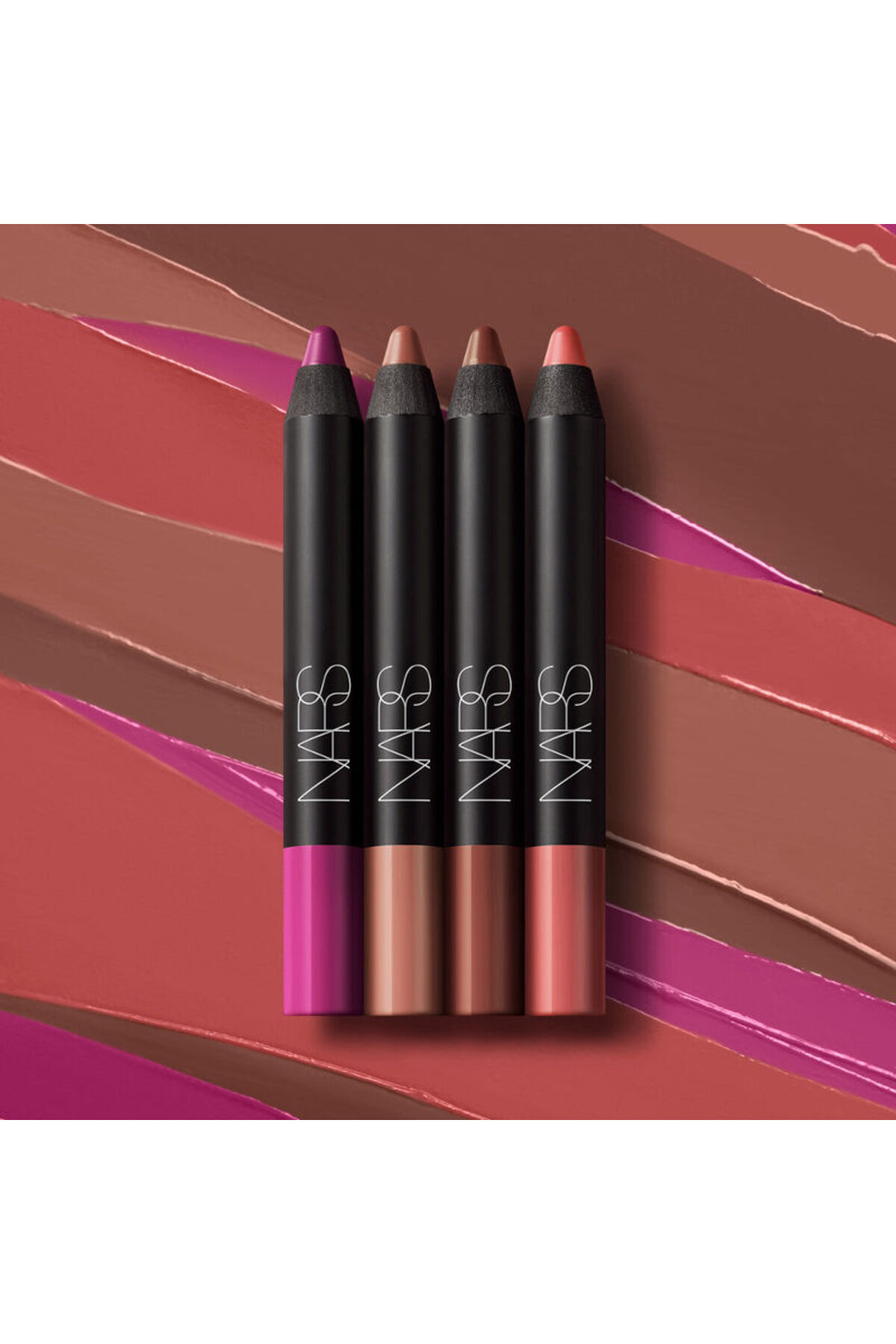 The effect of matte lipstick with the spontaneity of a pencil. Lips are instantly saturated with rich, vibrant pigments and a velvety matte finish. The non-drying formula is enriched with vitamin E and emollients for a creamy texture, while the unique combination of silicones ensures matte color lasts for hours. The jumbo size allows the lipstick to be applied with the ease of an artist pencil, and the tapered tip is perfect for lining, defining and filling in lips. Works best with Nars sharpener. Other sharpeners may be harmful or damaging.